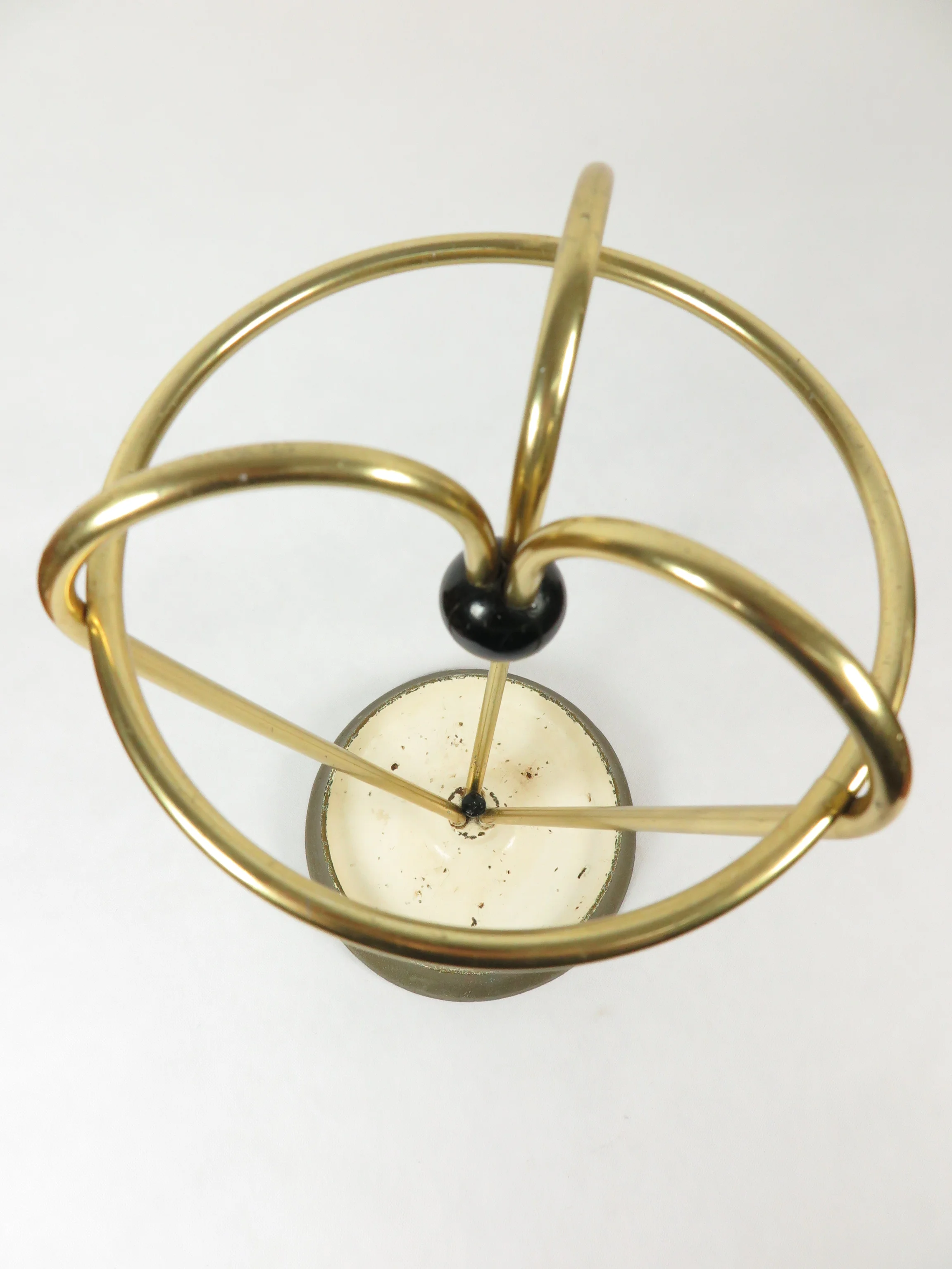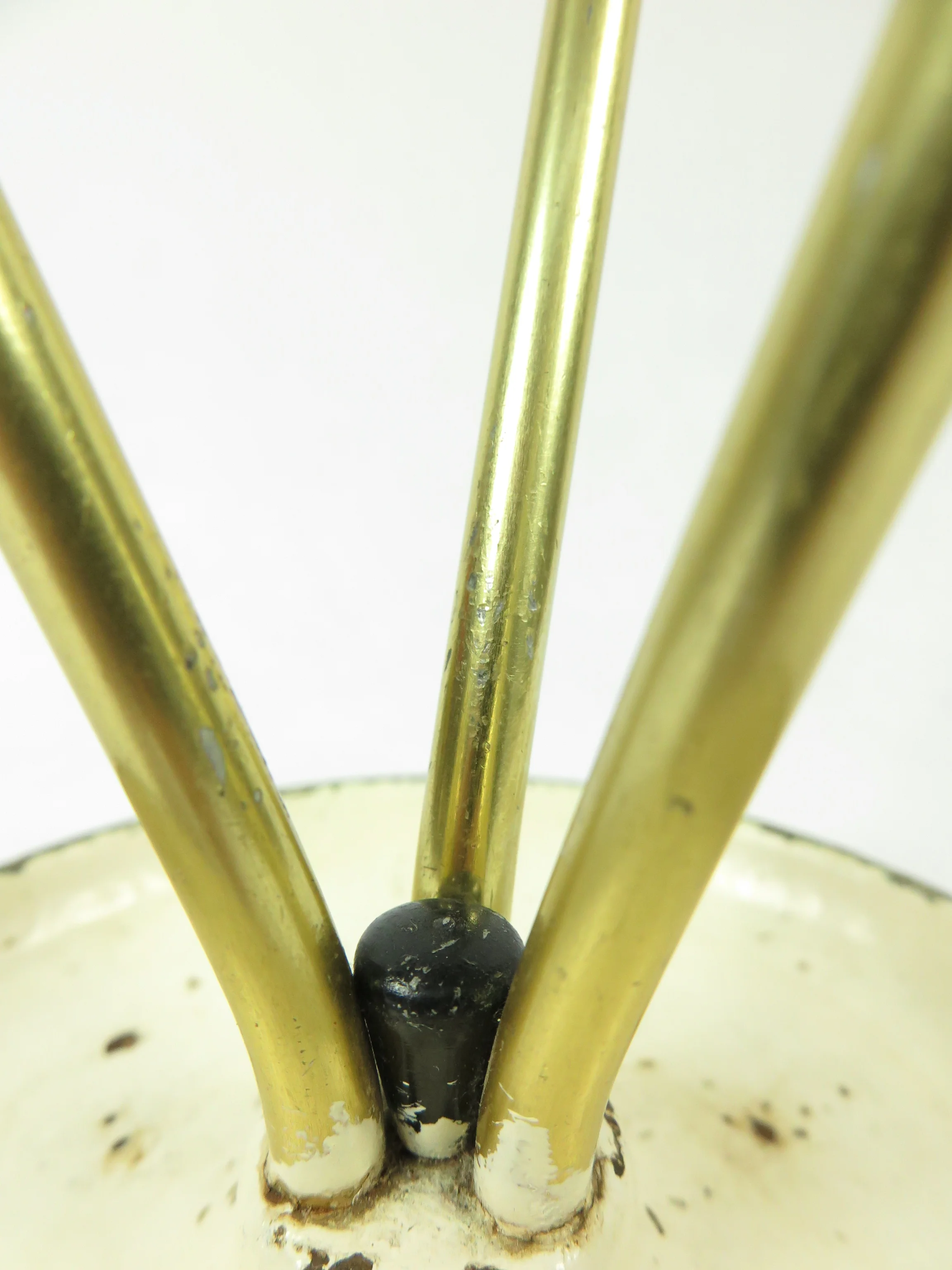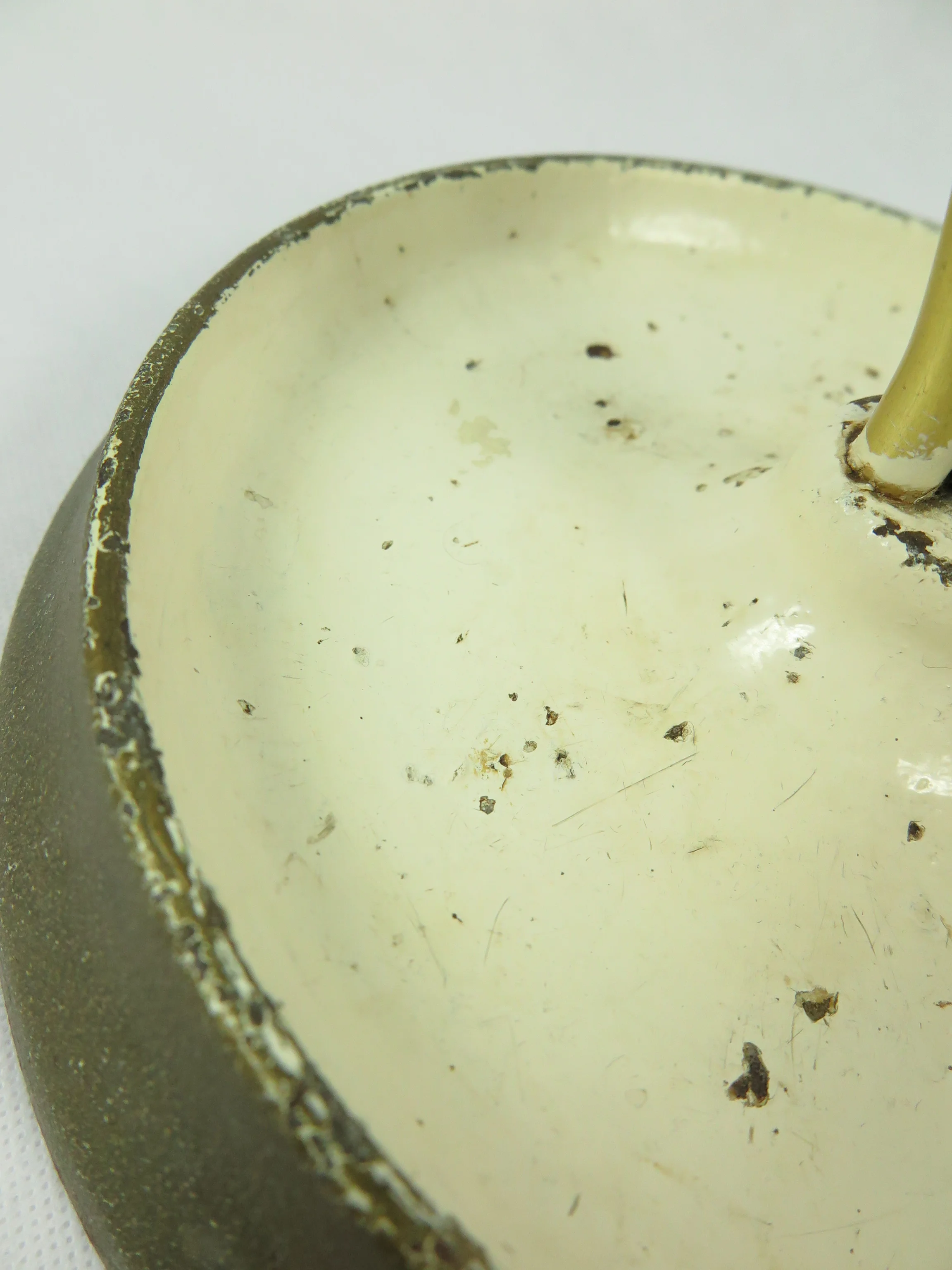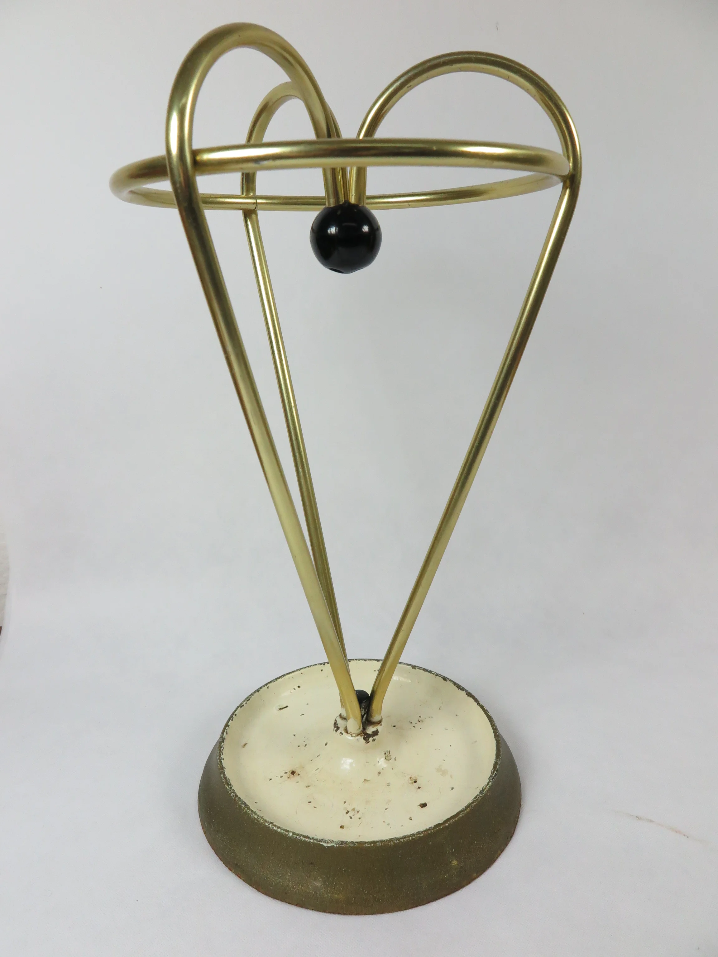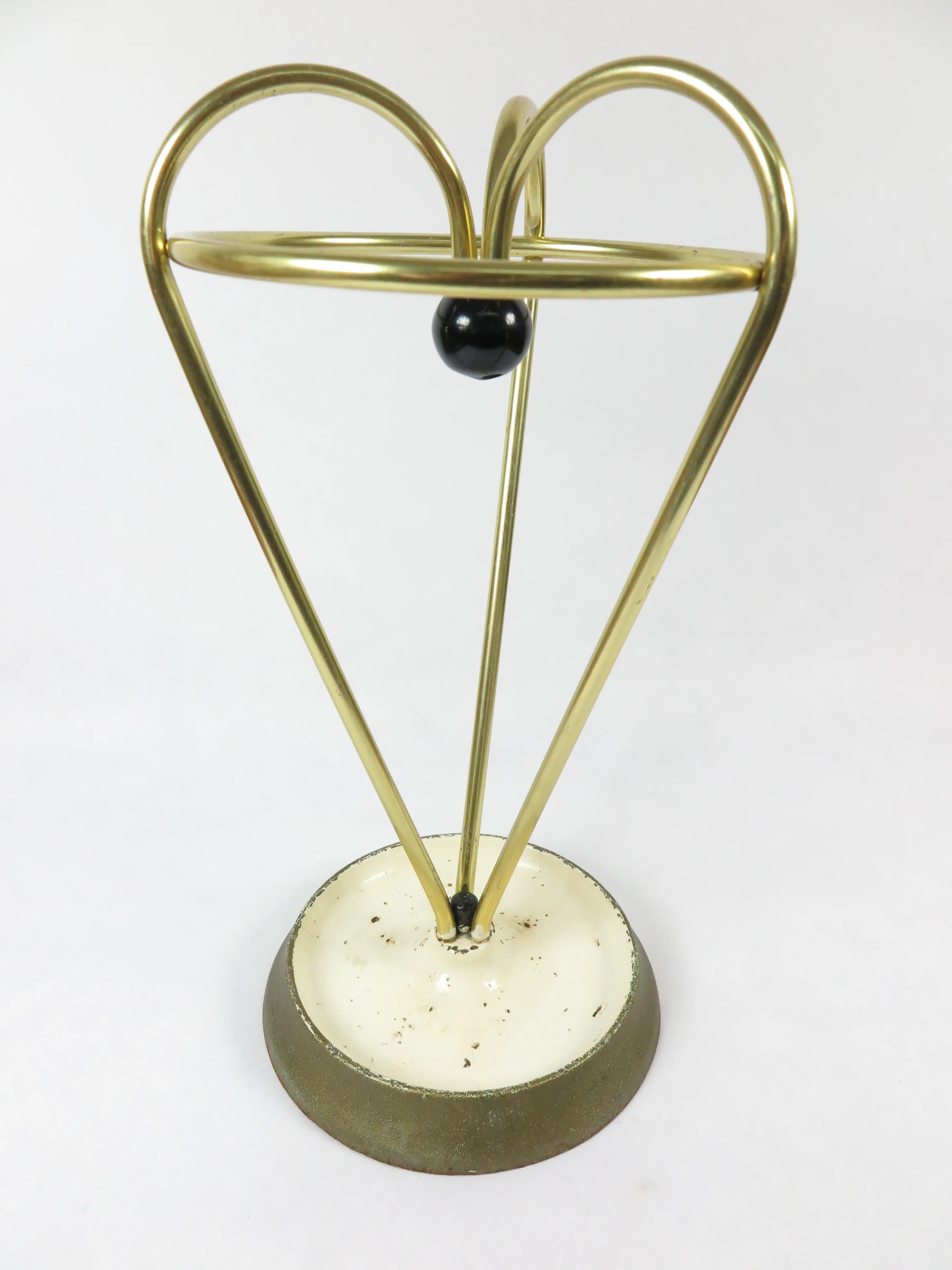 Der formschöne Ständer ist aus Messing, hat oben eine schwarze Kunststoffkugel und unten eine crème gestrichene gußeiserne Schale. Auf der Unterseite ist sie etwas angerostet.