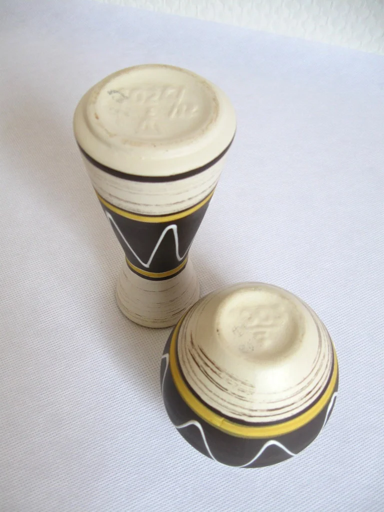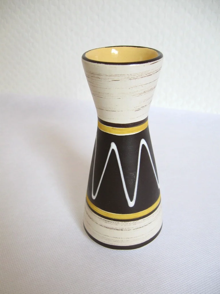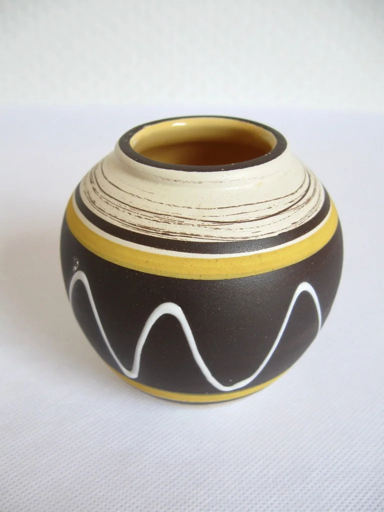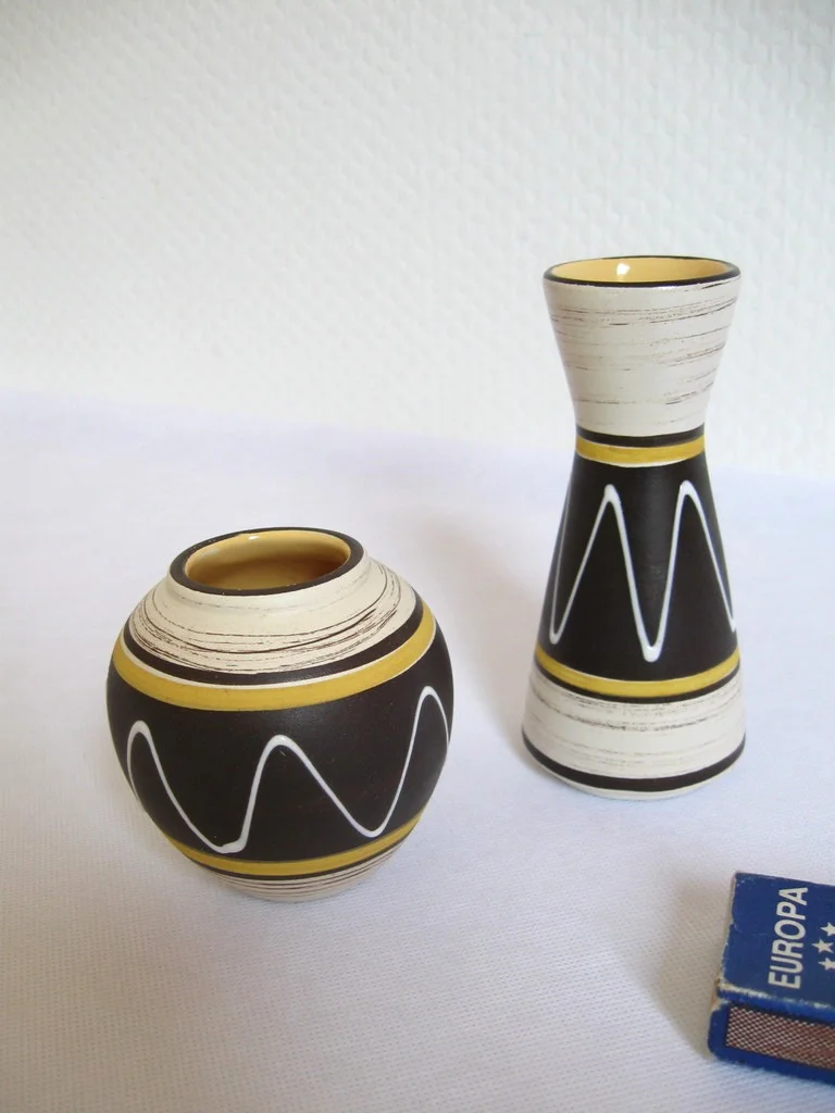 Die Vasen sind aus Keramik und haben eine rauhe Oberfläche und eine glasierte Verzierung.