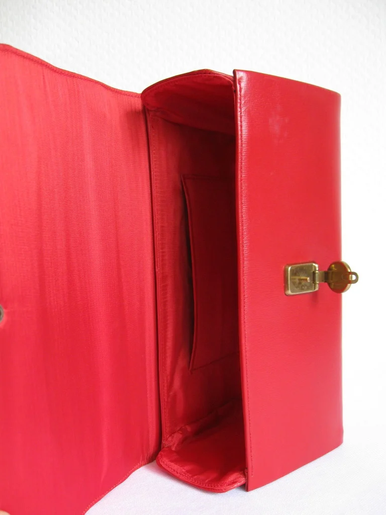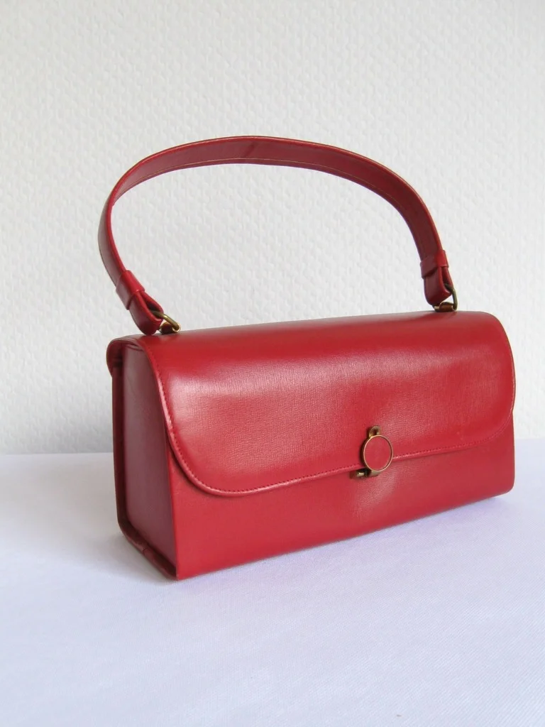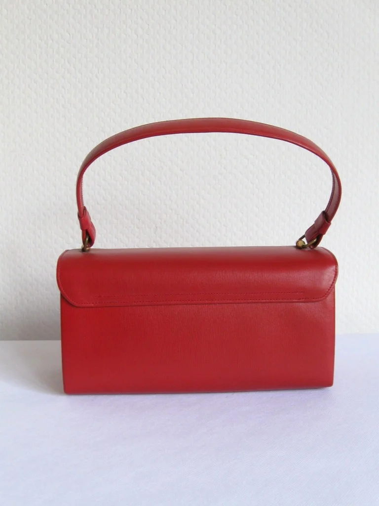 Die Handtasche ist aus rotem Leder und hat einen Trageriemen. Innen befindet sich eingroßes Fach und ein kleines Seitenfach.