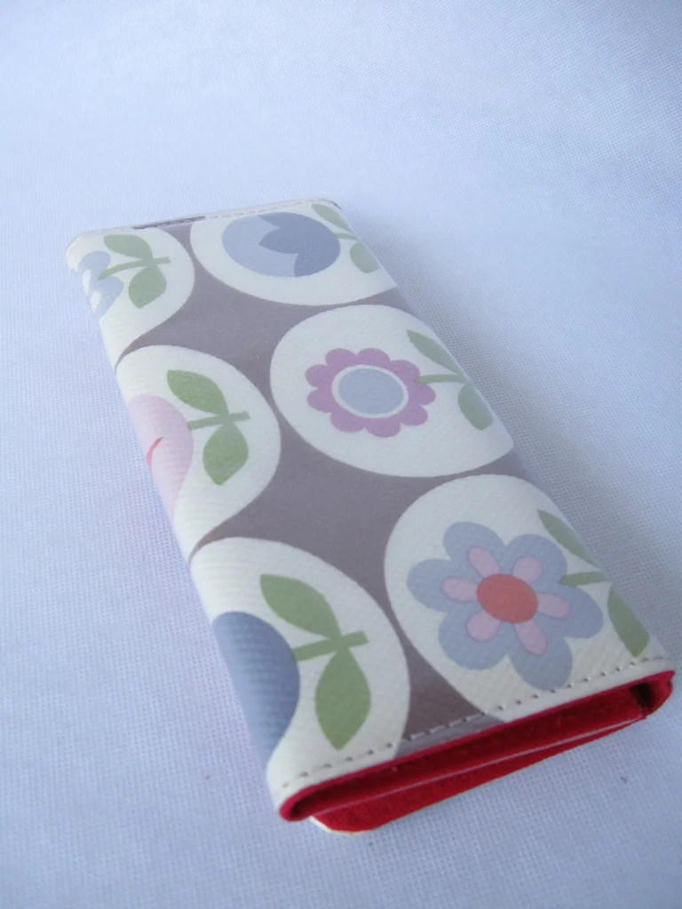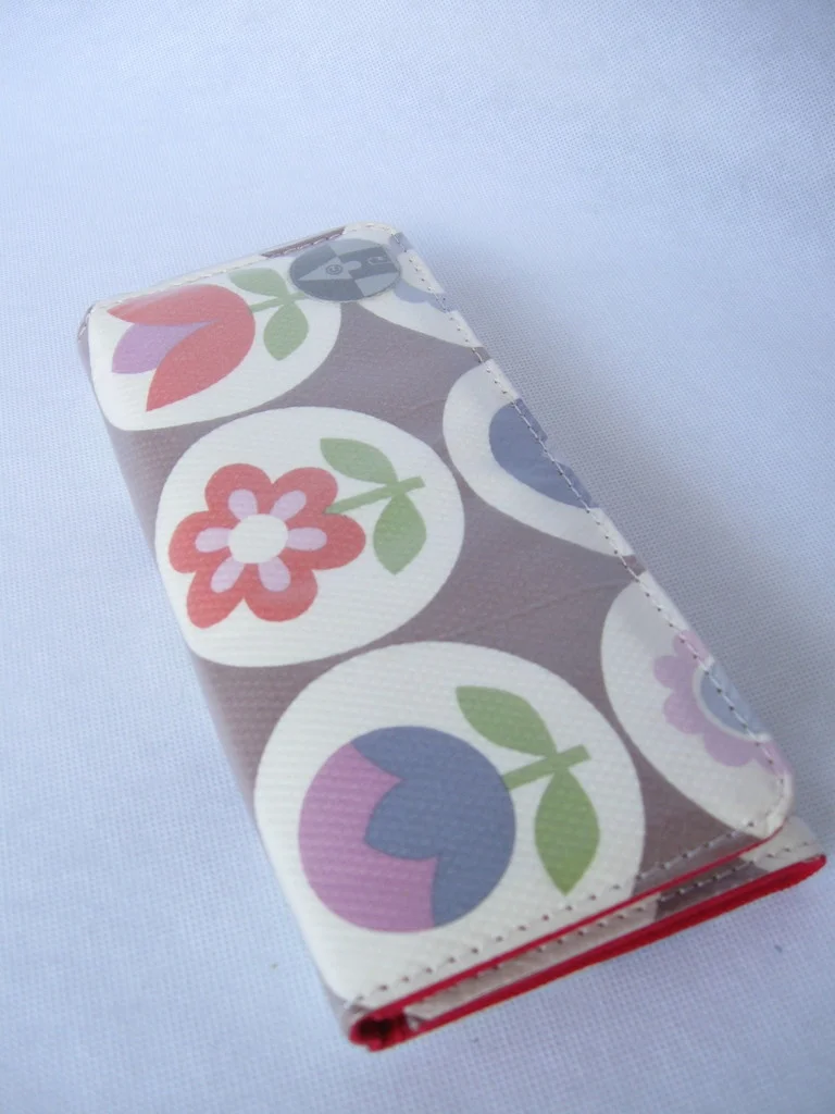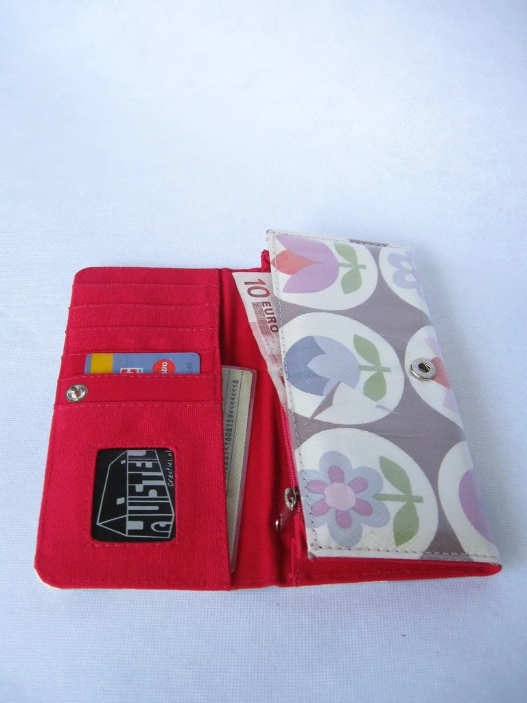 Außen besteht das Portemonnaie aus wasserabweisendem, gewachsten Stoff und innen ist es mit festem Leinenstoff ausgestattet.