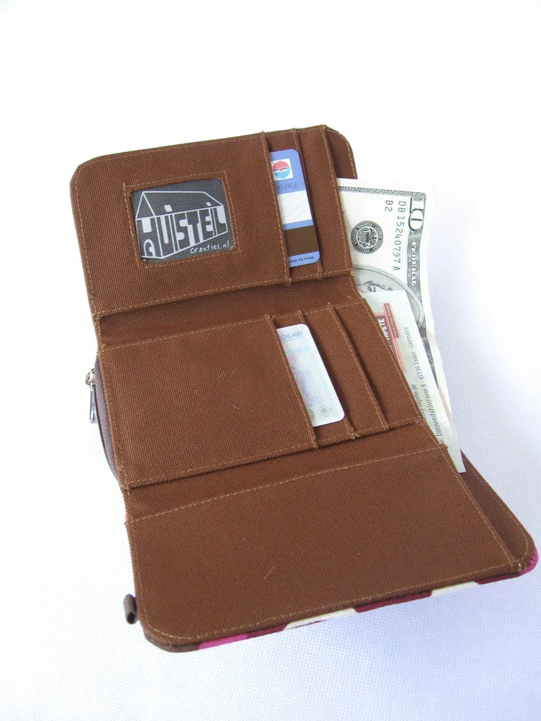 Es beinhaltet 1 Kartenfach mit Ausschnitt (für z.B. Passfoto), 5 Kartenfächer, 3 vertikale Extrafächer, ein großes Scheinfach und 1 zweifach unterteiltes Reißverschlussfach für Münzgeld.