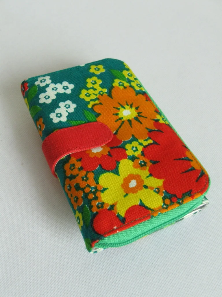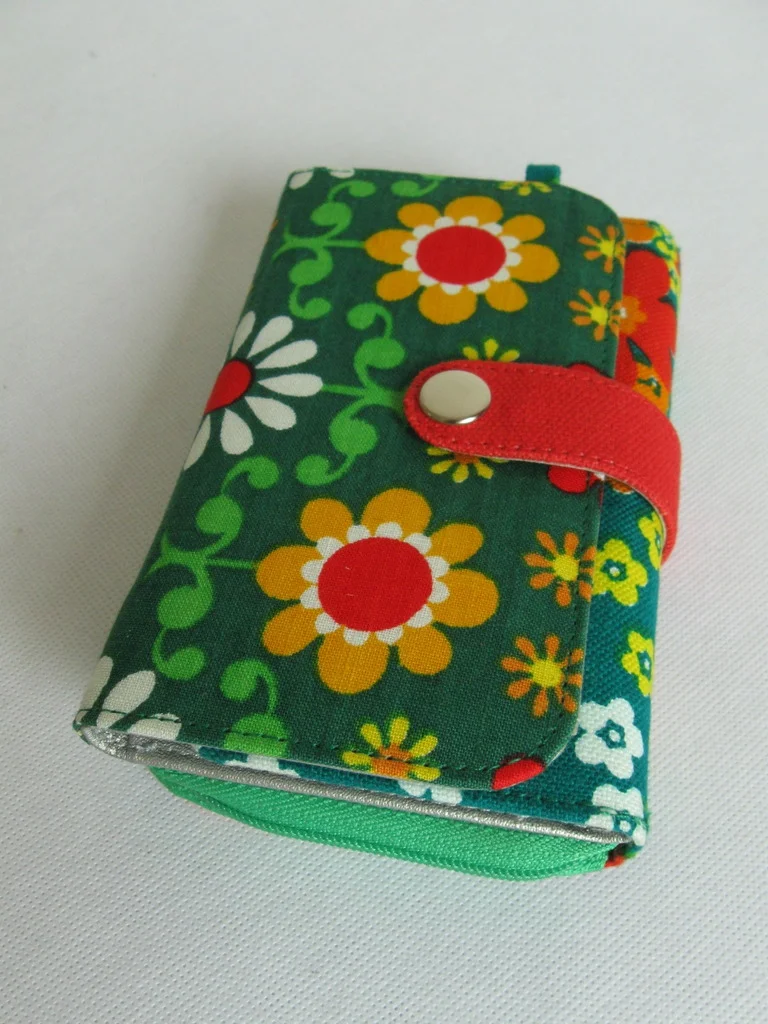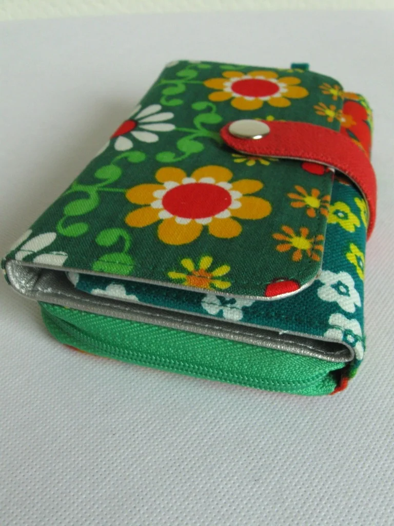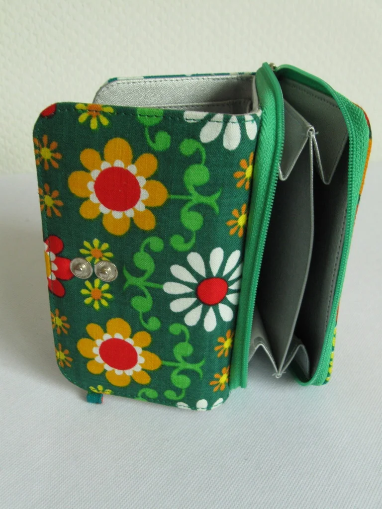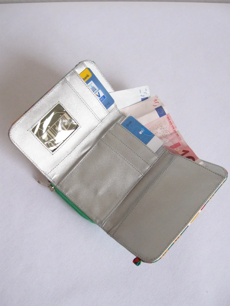 Portemonnaie aus Designerstoff, mit zwei Druckknöpfen zum Schließen.