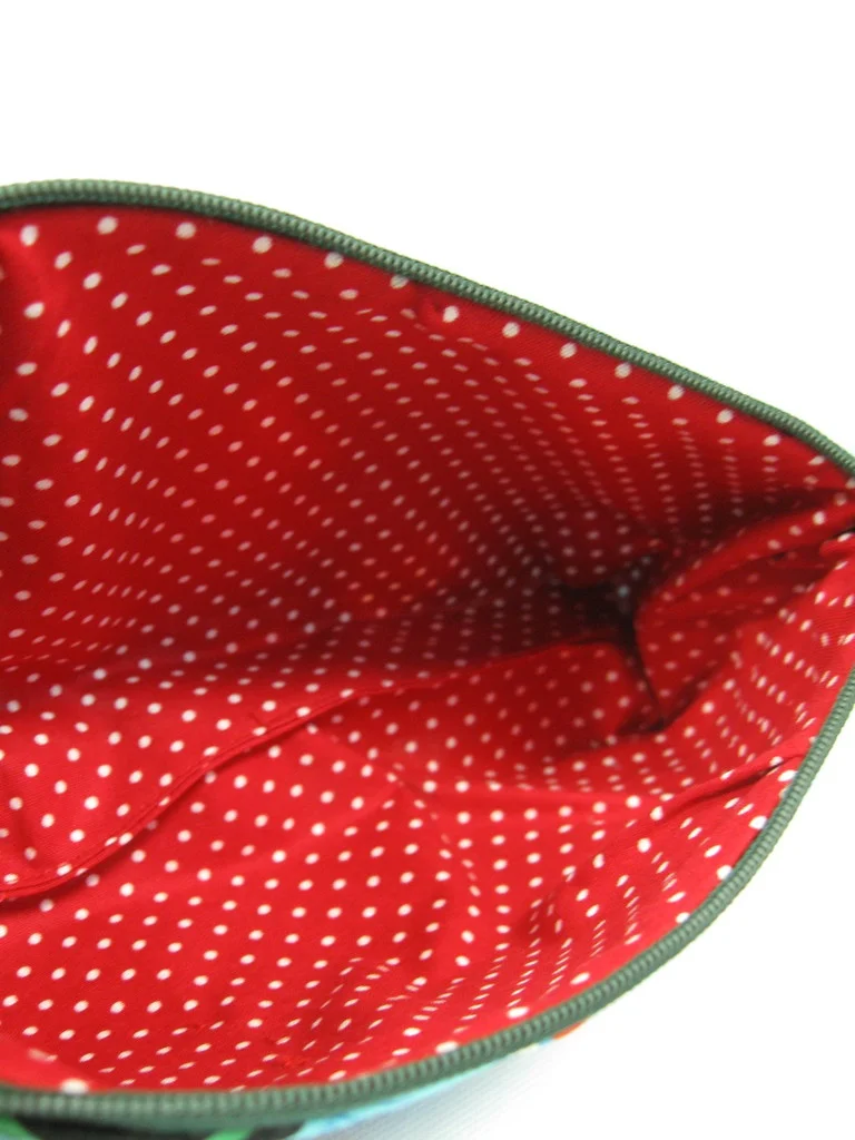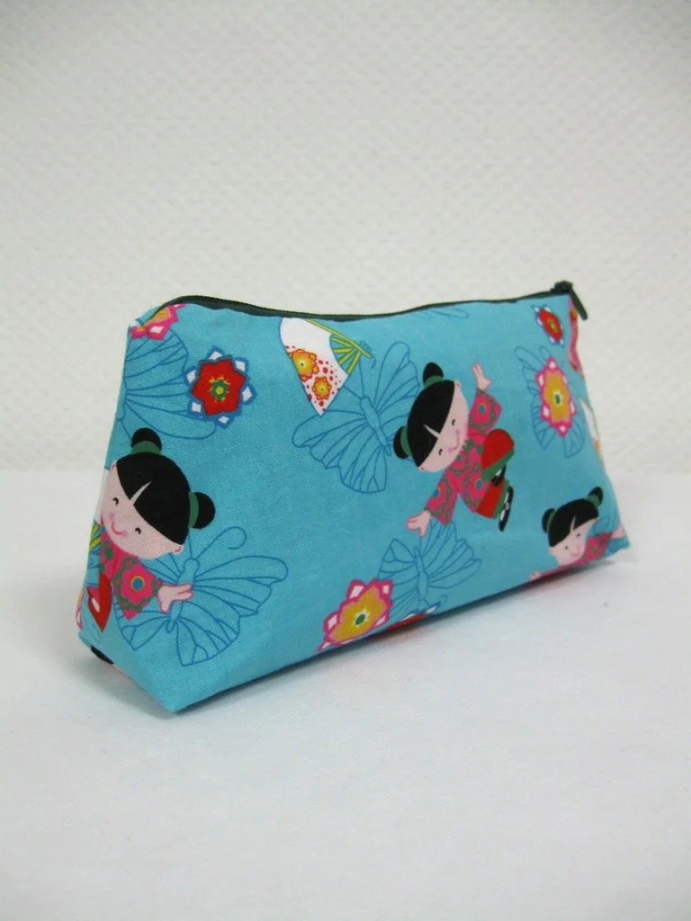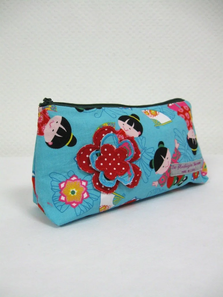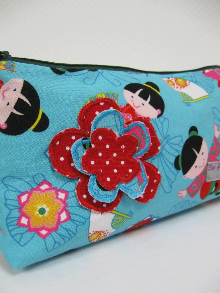 Das Etui ist aus Baumwollstoffen, hat eine schöne Applikation und wird über einen Reißverschluss verschlossen.