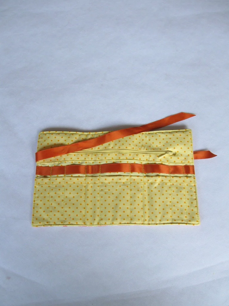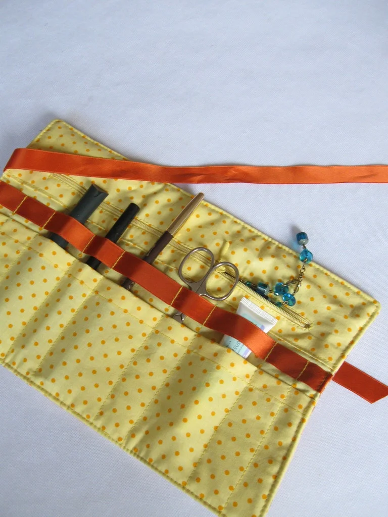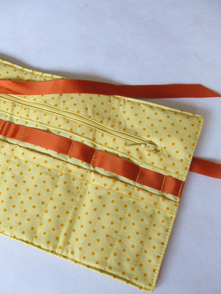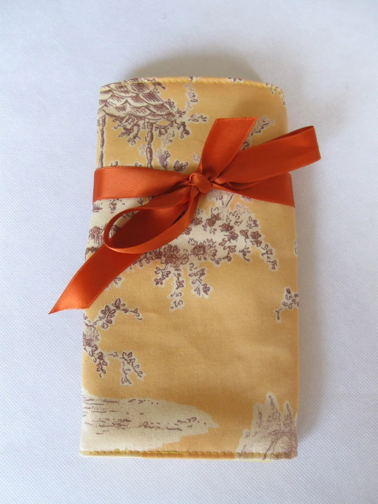 Das Täschchen ist aus gepolsterter Baumwolle und wird mit einem Seidenband verschlossen.