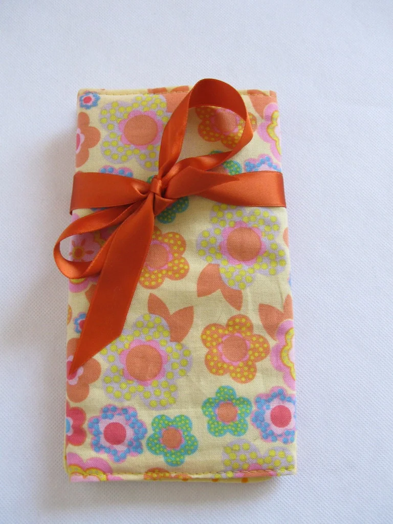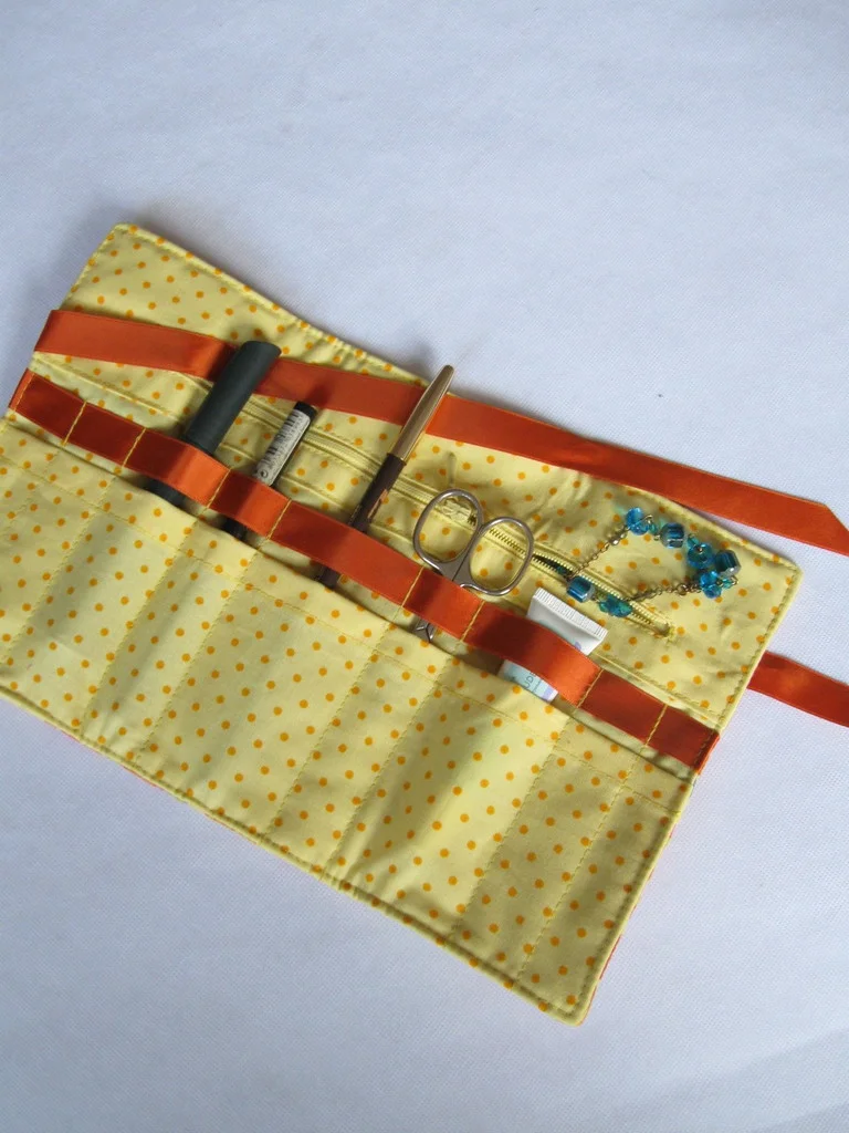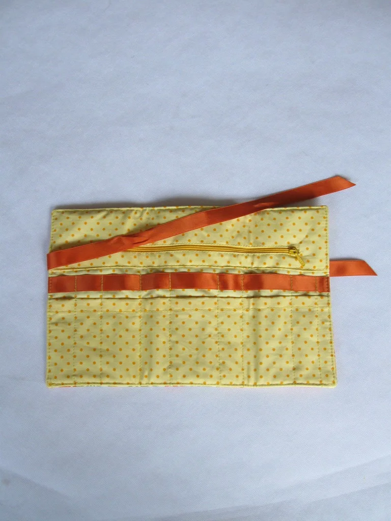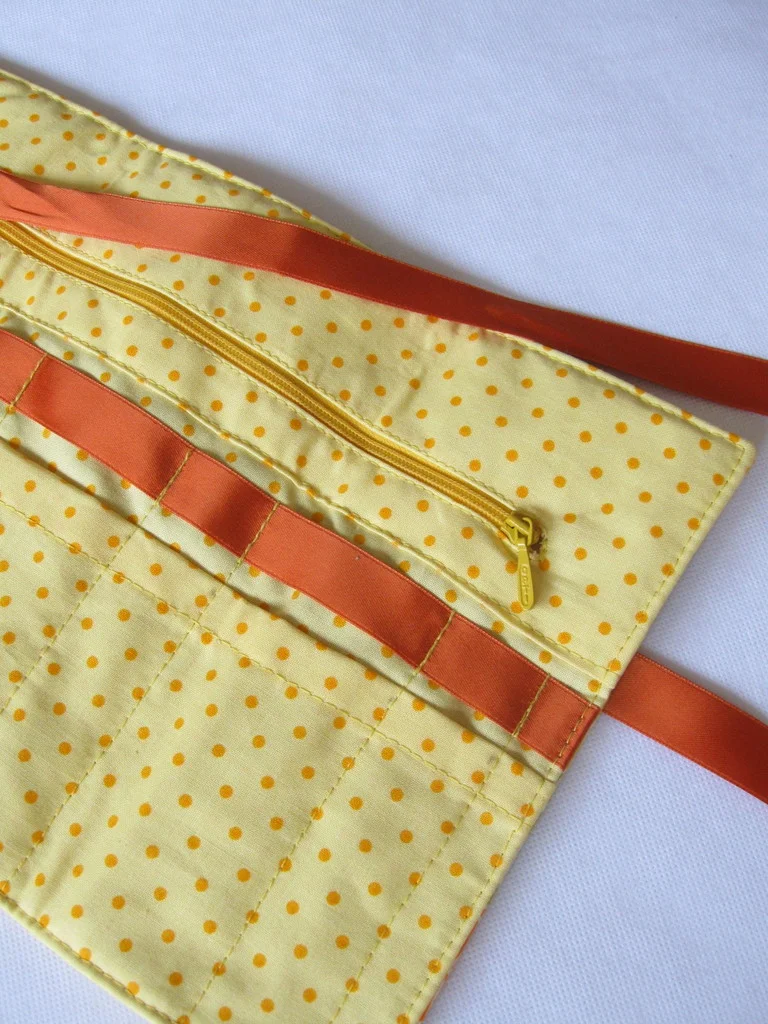Das Täschchen ist aus gepolsterter Baumwolle und wird mit einem Seidenband verschlossen.