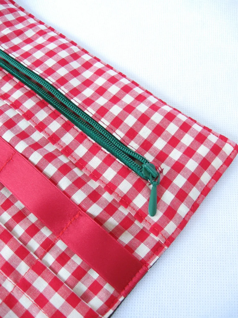 Das Täschchen ist aus gepolsterter Baumwolle und wird mit einem Seidenband verschlossen.