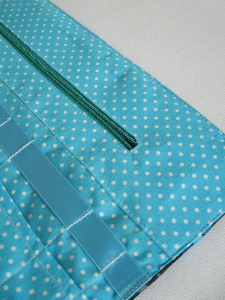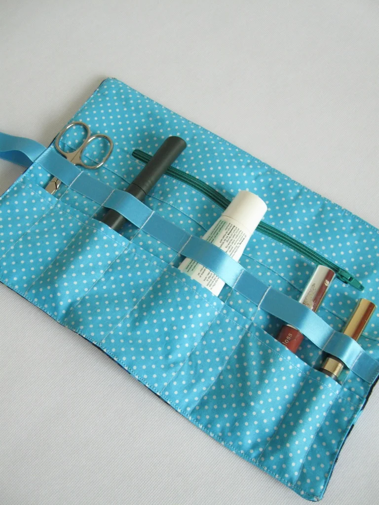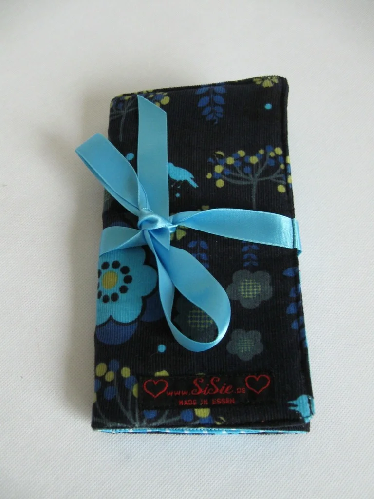 Das Täschchen ist aus gepolsterter Baumwolle und wird mit einem Seidenband verschlossen.