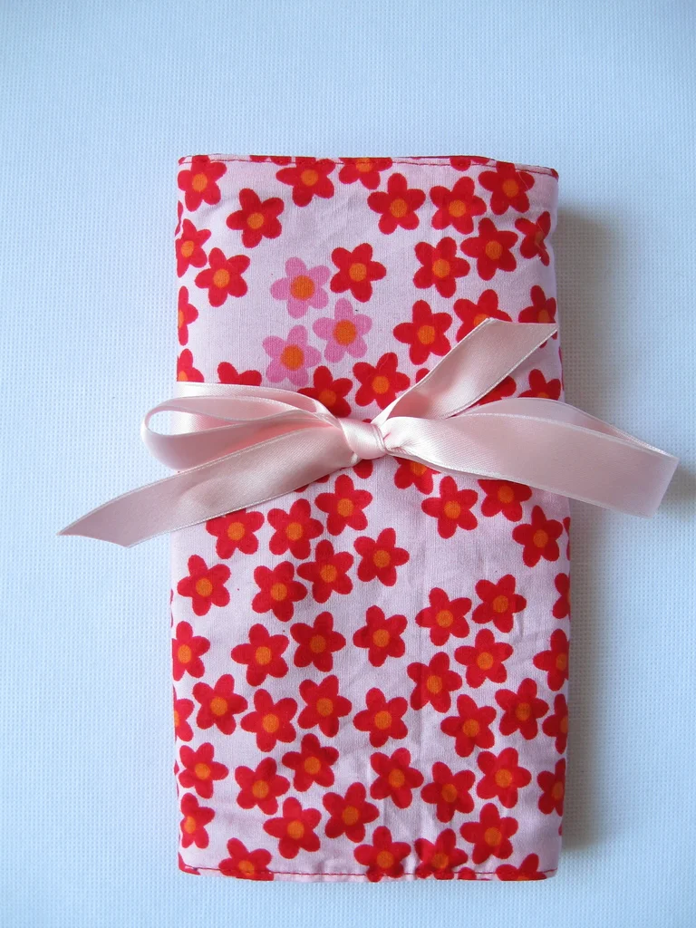 Das Täschchen ist aus gepolsterter Baumwolle und wird mit einem Seidenband verschlossen.