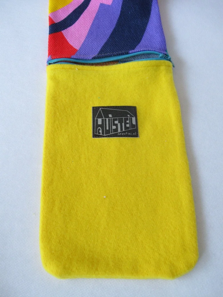 Der Schal besticht durch seine schönen bunten und knalligen Farben. An einem Ende des Schals ist eine Tasche aus Fleece angebracht, die mit einem Reißverschluss versehen ist.