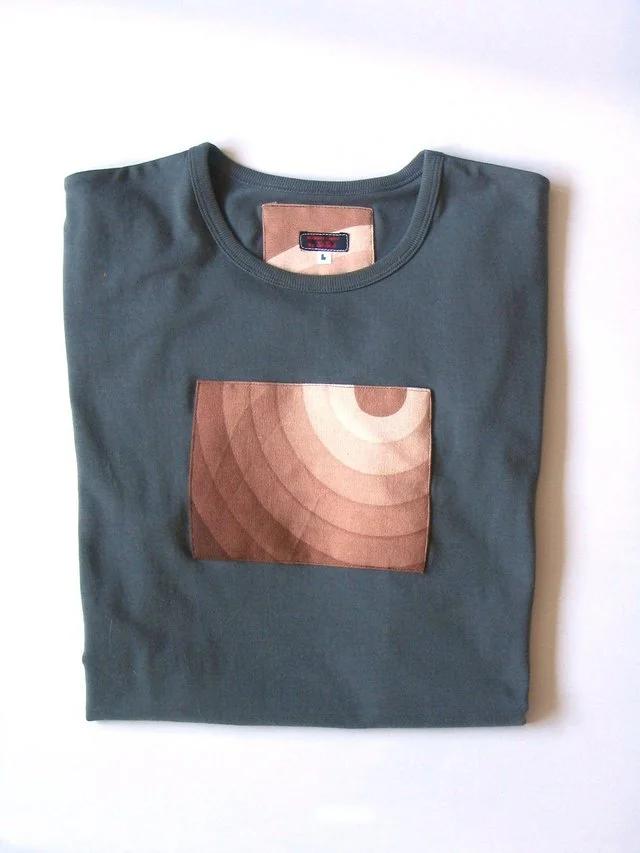 Das neue Shirt ist auf der Vorderseite und am rechten Ärmel mit einem original "Verner Panton" Stoff aus den 70er Jahren verziert.Es kann 30 Grad gewaschen werden.