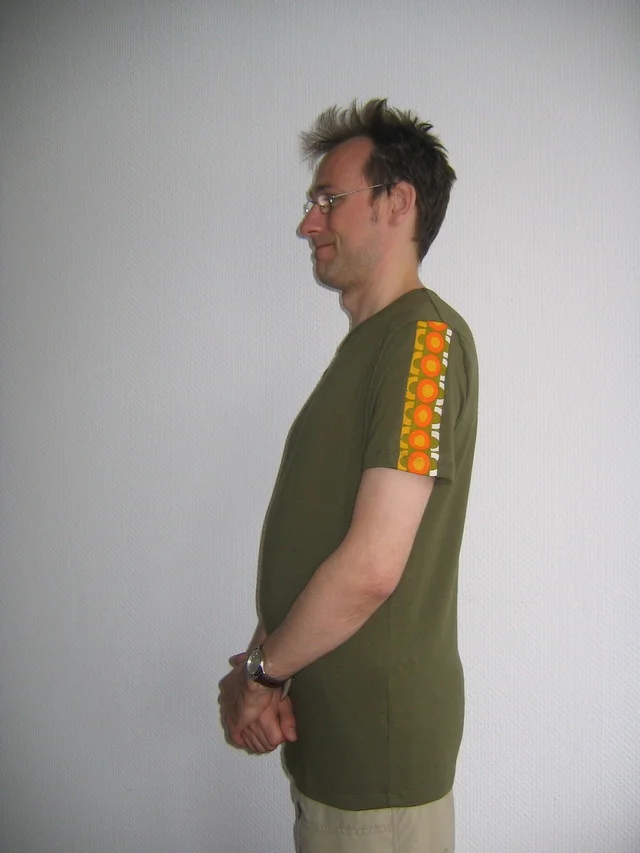 Das neue Shirt ist mit einem Originalstoff aus den 70er Jahren auf der Rückseite und an beiden Ärmeln verziert. Es kann 30 Grad gewaschen werden.