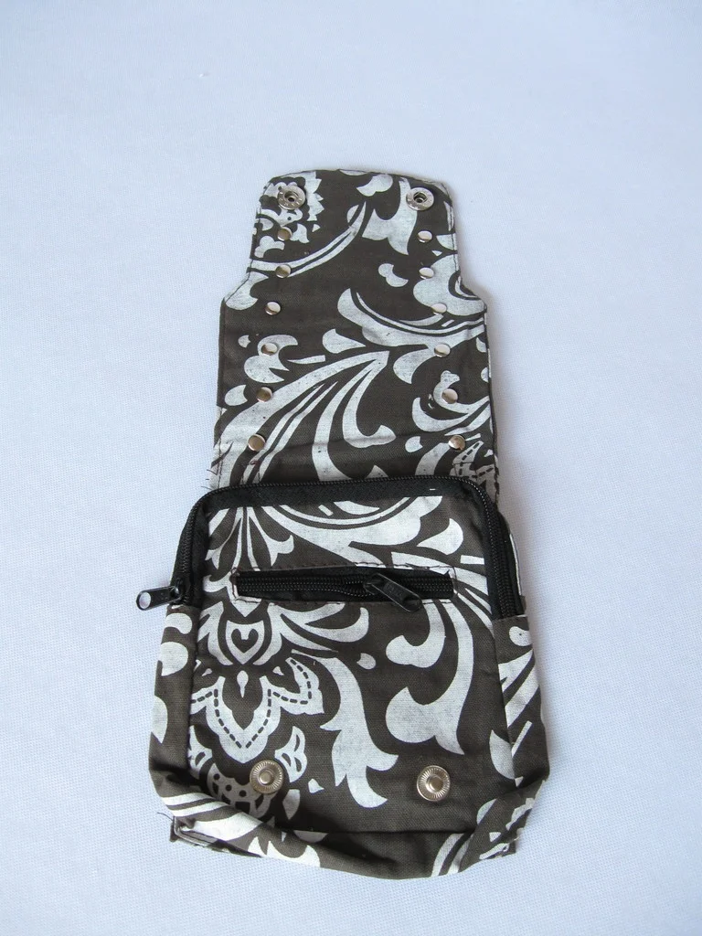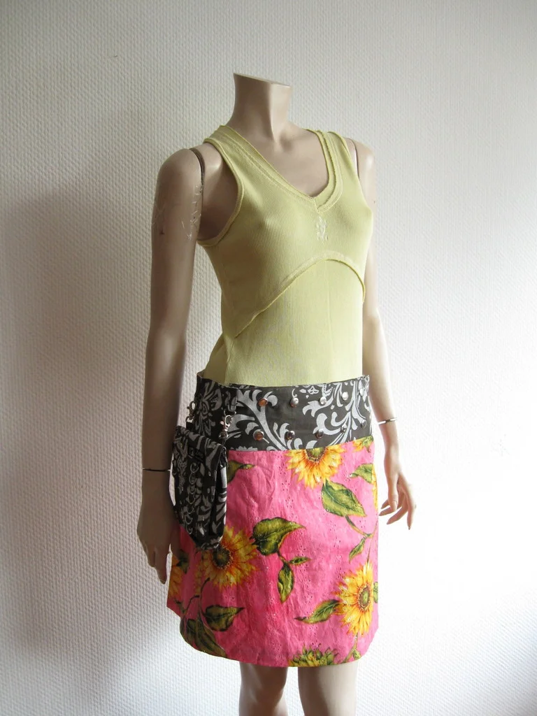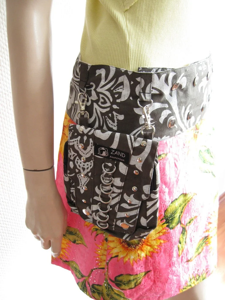 Als nettes Accessoires hat der Rock eine abnehmbare Tasche. Diese ist mit Karabinerhaken am Rock befestigt. Die Tasche ist mit verchromten Ringen und Nieten abgesetzt und wird mit zwei Druckknöpfen verschlossen. Die zwei Fächer der Tasche werden je mit einem Reißverschluss geöffnet.