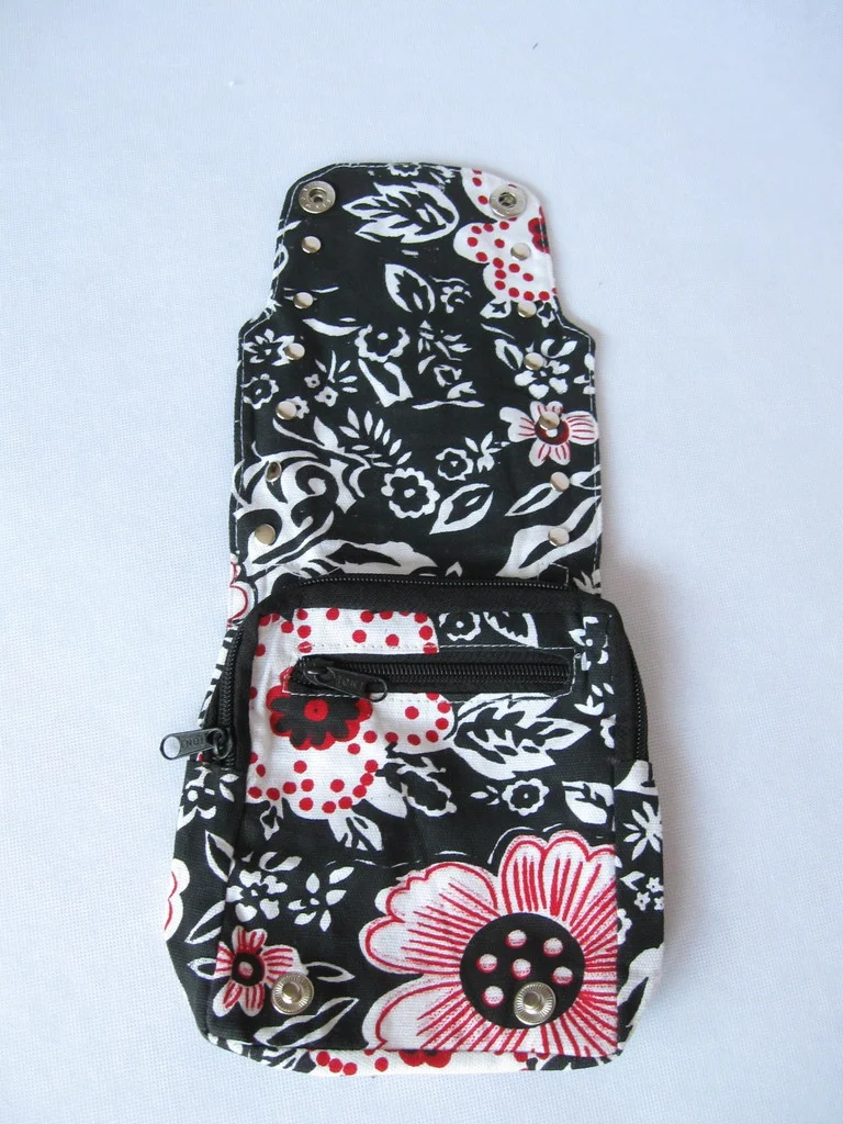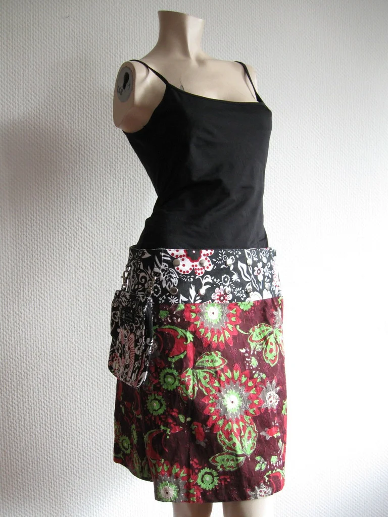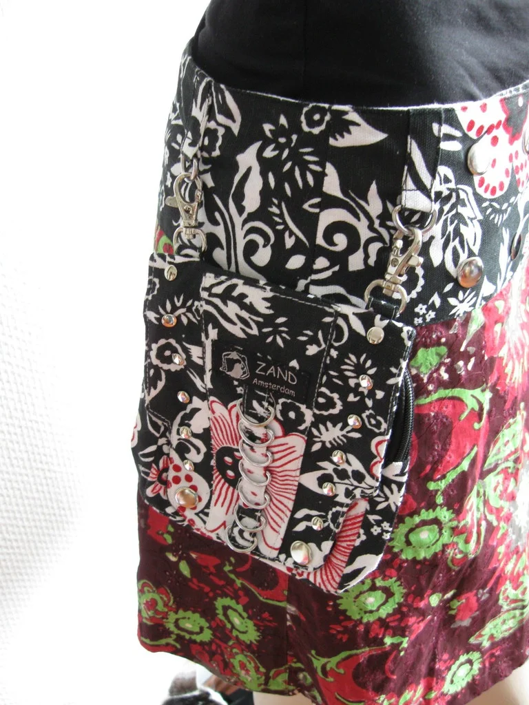 Als nettes Accessoires hat der Rock eine abnehmbare Tasche. Diese ist mit Karabinerhaken am Rock befestigt. Die Tasche ist mit verchromten Ringen und Nieten abgesetzt und wird mit zwei Druckknöpfen verschlossen. Die zwei Fächer der Tasche werden je mit einem Reißverschluss geöffnet.