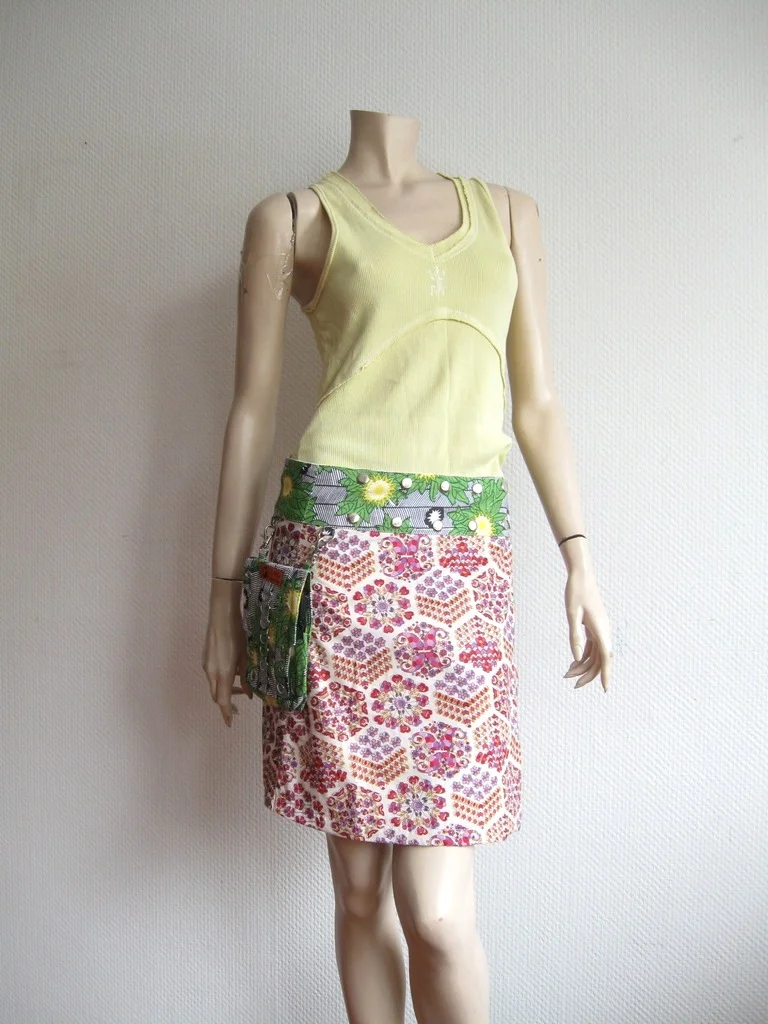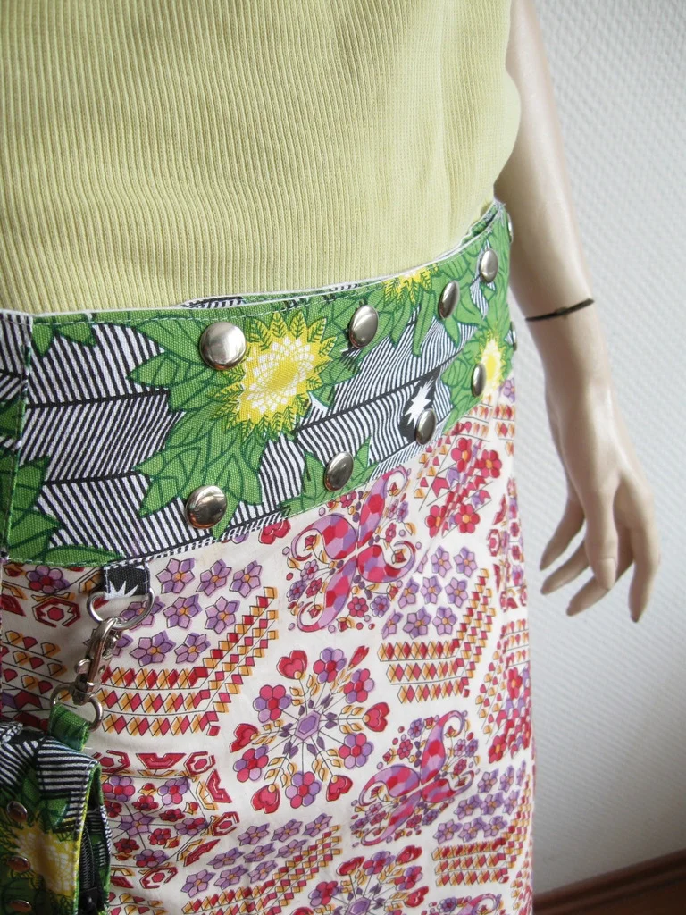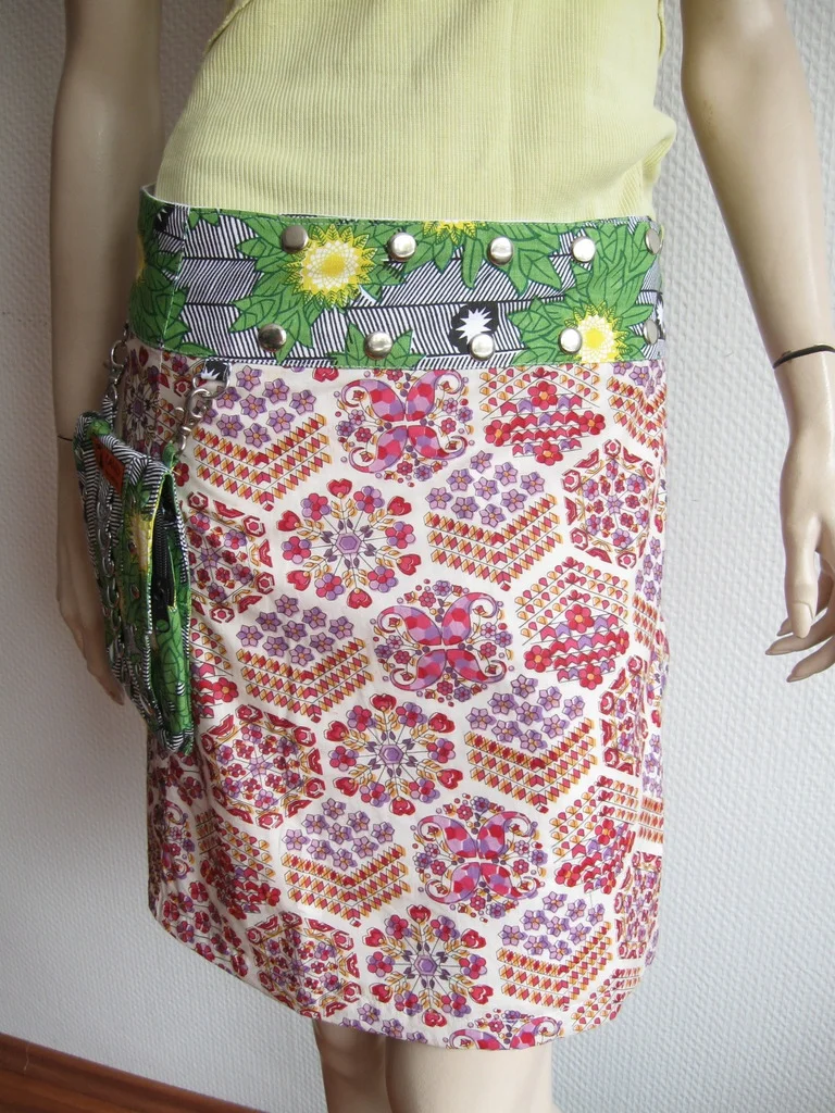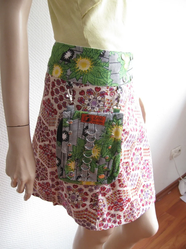 Als nettes Accessoire hat der Rock eine abnehmbare Tasche. Diese ist mit Karabinerhaken am Rock befestigt. Die Tasche ist mit verchromten Ringen und Nieten abgesetzt und wird mit zwei Druckknöpfen verschlossen. Die zwei Fächer der Tasche werden je mit einem Reißverschluss geöffnet.