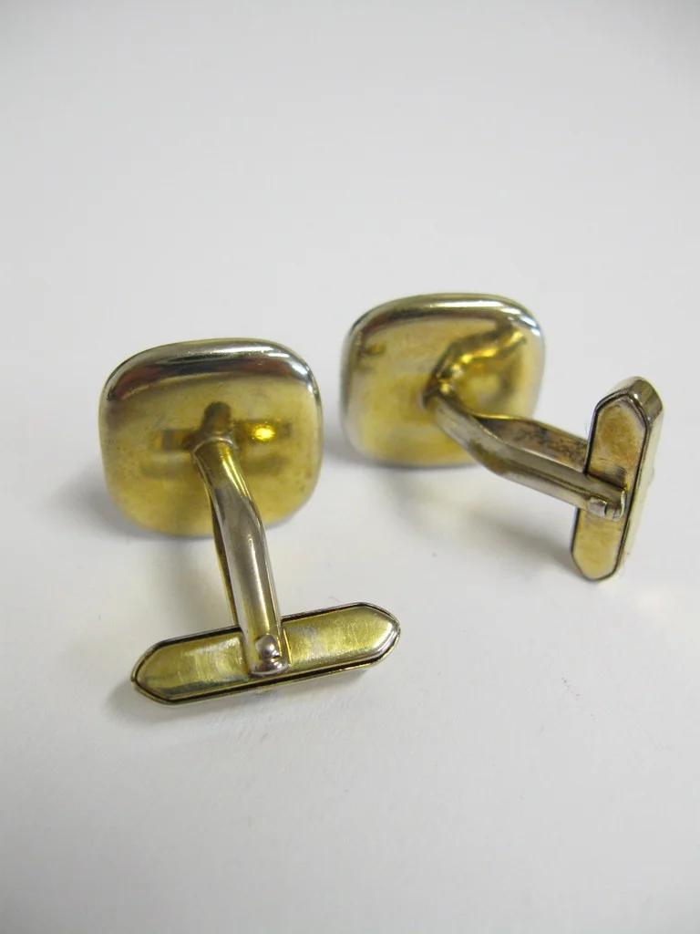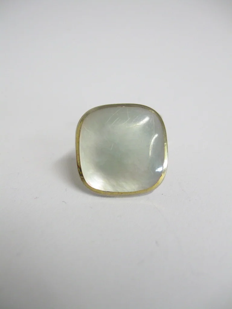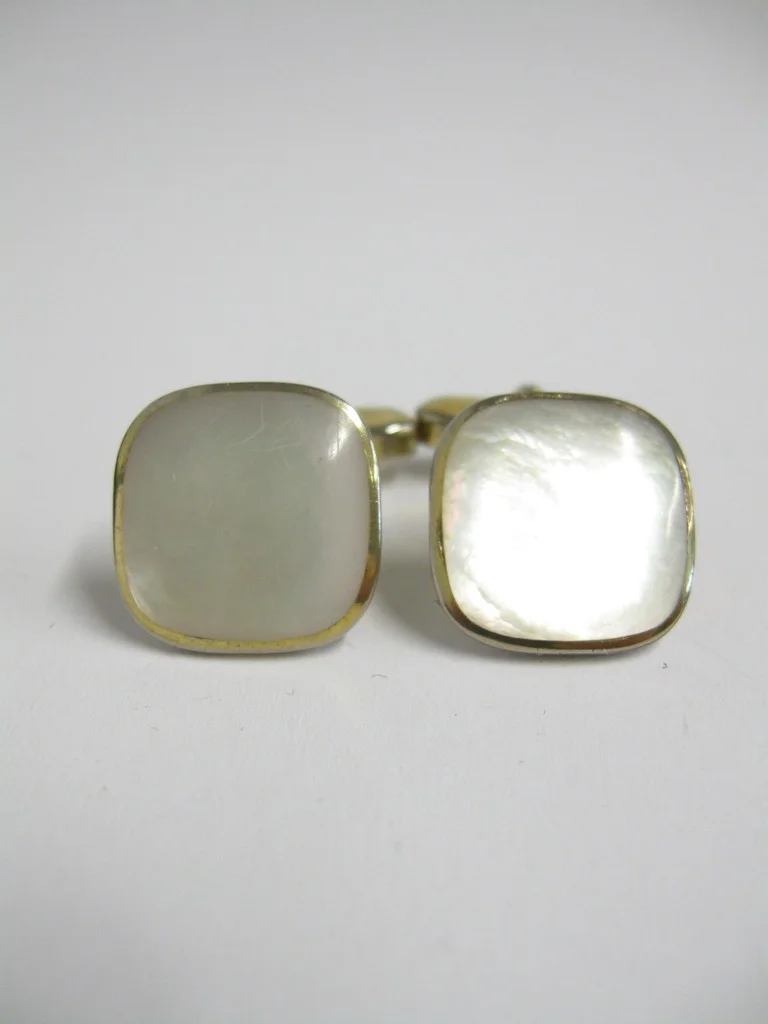 Die Knöpfe bestehen aus goldfarbenem Metall und haben einen Perlmutteinsatz. Als Schließmechanik dient ein Schwenkbügel.