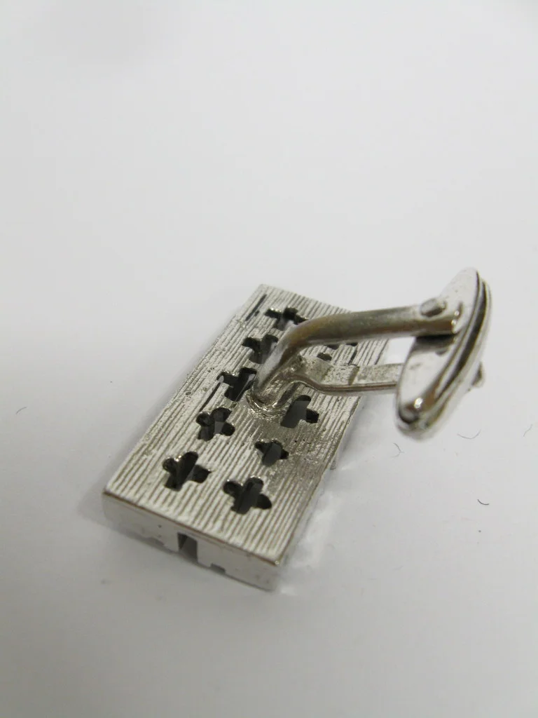 Die Knöpfe bestehen aus verchromtem Metall und haben ein zeittypisches Design. Als Schließmechanik dient ein Schwenkbügel.