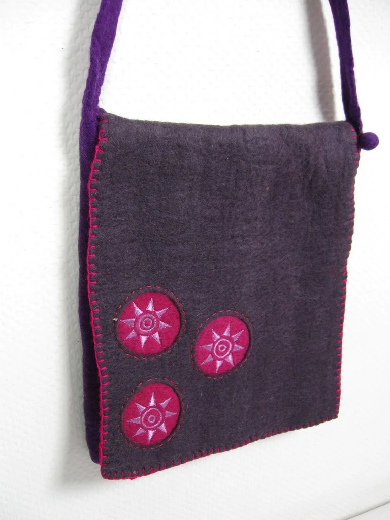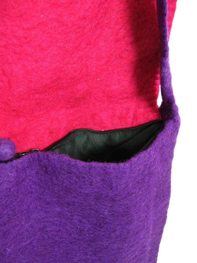 Die Tasche ist aus handgefilzter Wolle und hat eine Innentasche aus Baumwolle. Letztere ist mit einem Reißverschluss zu öffnen, an dem ein kleiner Filzbommel hängt.