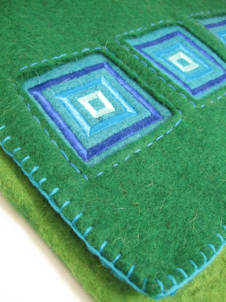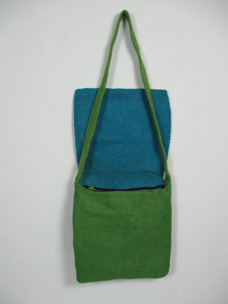 Die Tasche ist aus handgefilzter Wolle und hat eine Innentasche aus Baumwolle. Letztere ist mit einem Reißverschluss zu öffnen, an dem ein kleiner Filzbommel hängt.