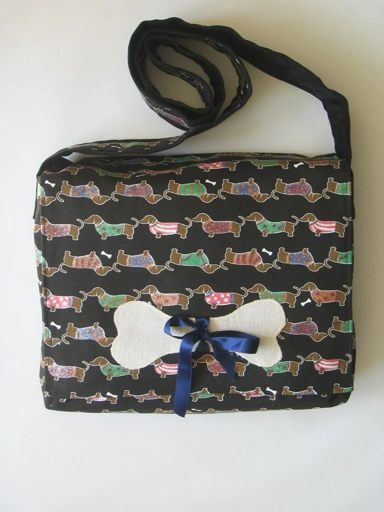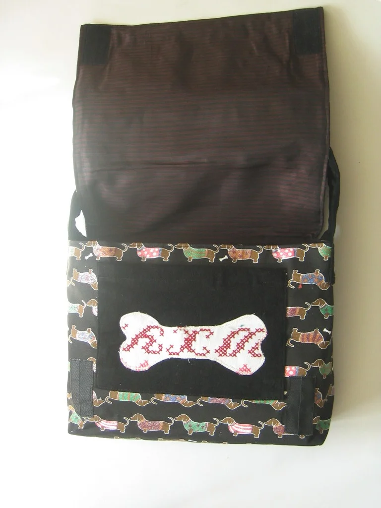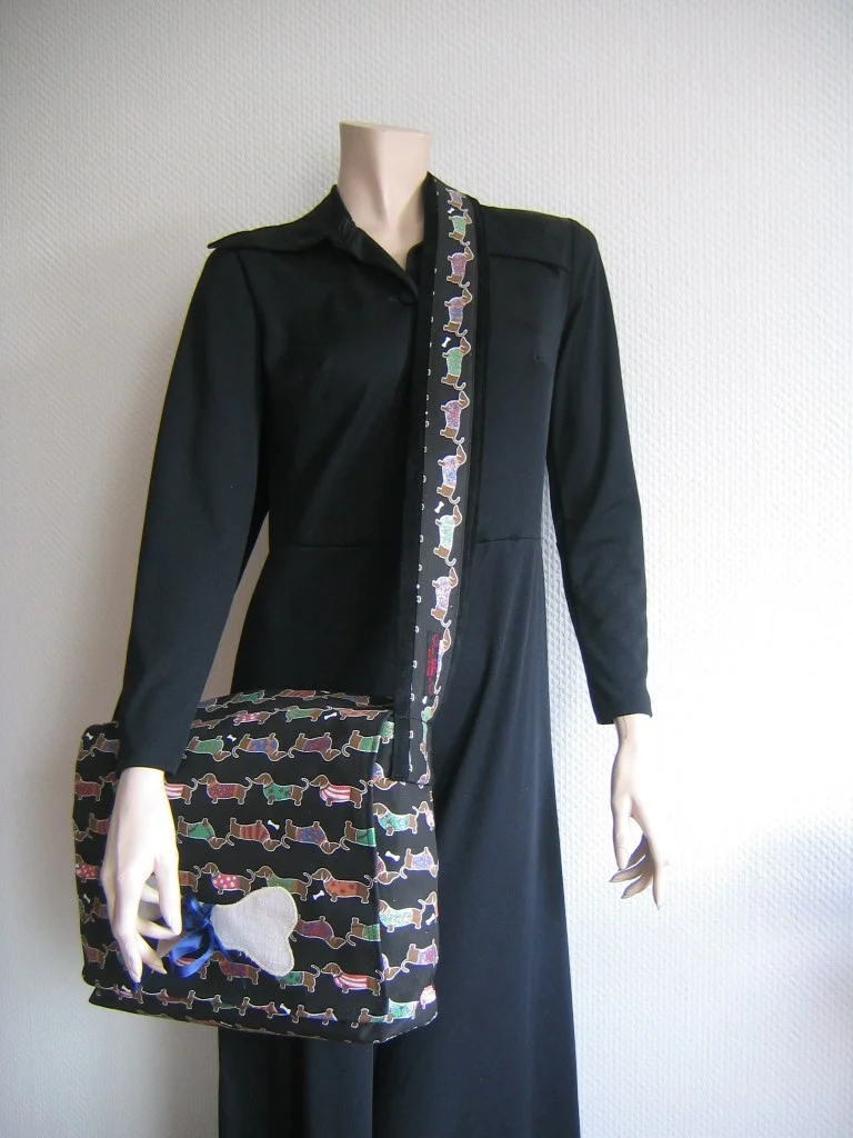 Diese Tasche aus besonders originellem Stoff mit Dackeldruck ist ein handgenähtes Unikat der Designerin SiSie.