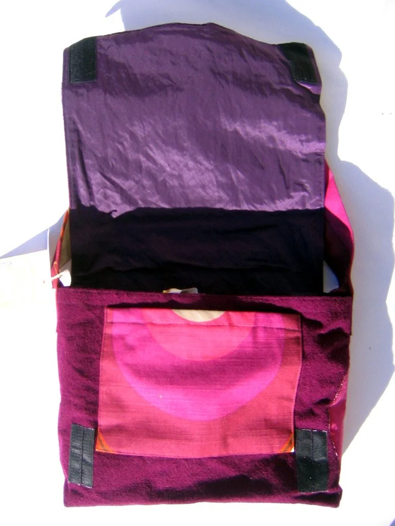 Unter der Taschenklappe ist zusätzlich eine kleine Extratasche (siehe Foto). Für die Festigkeit ist die gesamte Tasche mit einer Festeinlage verstäkt und farblich passend gefüttert. Der Tragegurt ist lang genug, sodass die Tasche auch seitlich über die Schulter getragen werden kann. Der Taschencorpus ist aus violettfarbenemWollstoff.