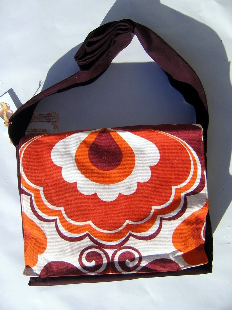 Diese Tasche mit original 70er Jahre Stoff ist ein handgenähtes Unikat der Designerin SiSie. Das große stilisierte Bütenmotiv ist typisch für die 70er Jahre.