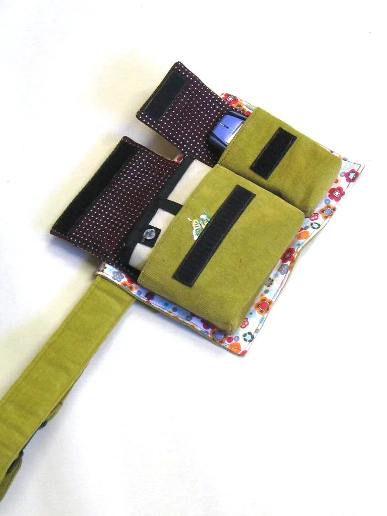 Die Tasche hat ein größeres Fach für ein Portemonnaie und ein kleineres für zB. ein Handy. Innen ist die Tasche mit einem passenden Blümchenstoff gefüttert. Auf der Rückseite befindet sich ein Geheimfach mit Reißverschluß.