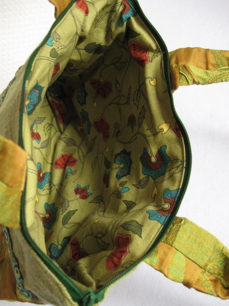 Die Tasche ist aus feinen Baumwollstoffen und wird mit einem Reißverschluss verschlossen.