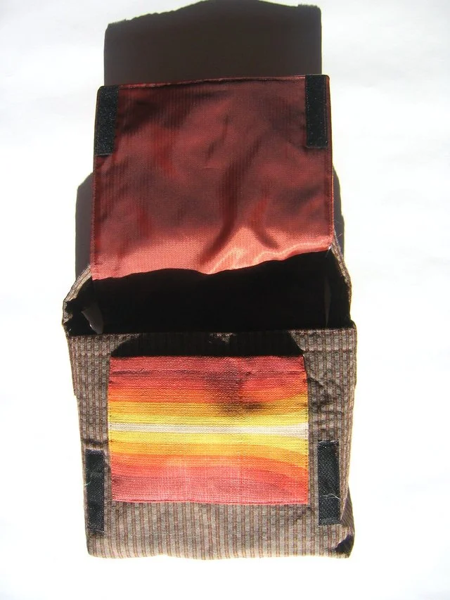 Der Taschenbeutel ist für die Festigkeit mit einer Einlage verstäkt und mit einem passenden Stoff gefüttert. Im Futter ist eine zweite Extratasche mit Reißverschluss eingenäht. Der Tragegurt mit einem Stückchen Originalstoff, ist lang genug, sodass die Tasche auch seitlich über die Schulter getragen werden kann.