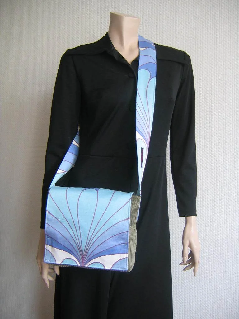 Der Taschenbeutel ist für die Festigkeit mit einer Einlage verstäkt und mit einem passenden Stoff gefüttert. Im Futter ist eine zweite Extratasche mit Reißverschluss eingenäht. Der Tragegurt (auch aus Originalstoff) ist lang genug, sodass die Tasche quer über der Schulter getragen werden kann.
