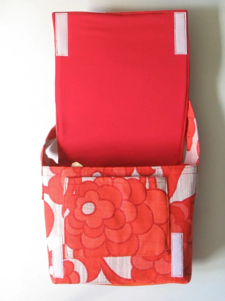 Der Taschenbeutel ist für die Festigkeit mit einer Einlage verstäkt und mit einem passenden Stoff gefüttert. Im Futter ist eine zweite Extratasche mit Reißverschluss eingenäht. Der Tragegurt (auch aus Originalstoff) ist lang genug, sodass die Tasche quer über der Schulter getragen werden kann.
