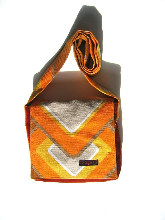 Diese Tasche mit original 70er Jahre Stoff ist ein handgehähtes Unikat der Designerin SiSie. Unter der Außenklappe aus Originalstoff ist ein fester, glänzender orangefarbener Samtstoff.
