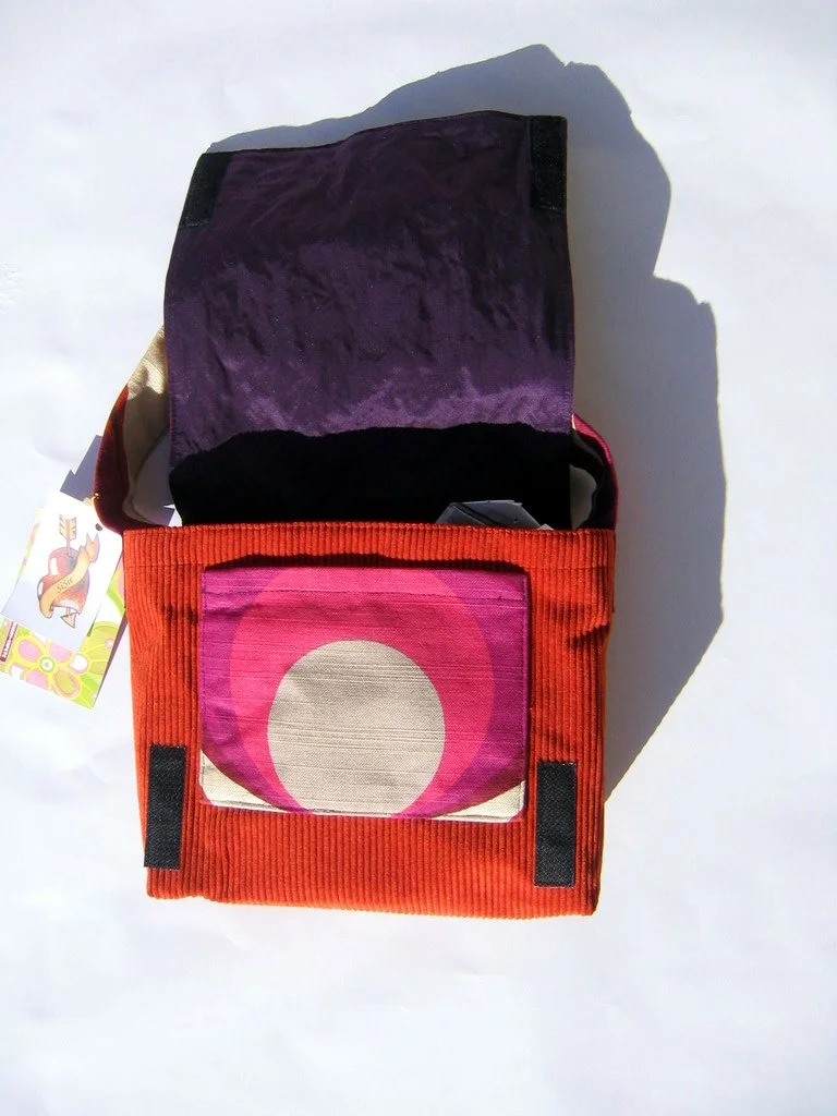 Unter der Taschenklappe ist zusätzlich eine kleine Extratasche (siehe Foto). Für die Festigkeit ist sie mit einer Festeinlage verstäkt und farbig passend gefüttert. Der Tragegurt ist lang genug, sodass die Tasche auch seitlich über die Schulter getragen werden kann. Der Taschencorpus ist aus orange farbenem Cordstoff, der farblich hervorragend zum Oberstoff passt.