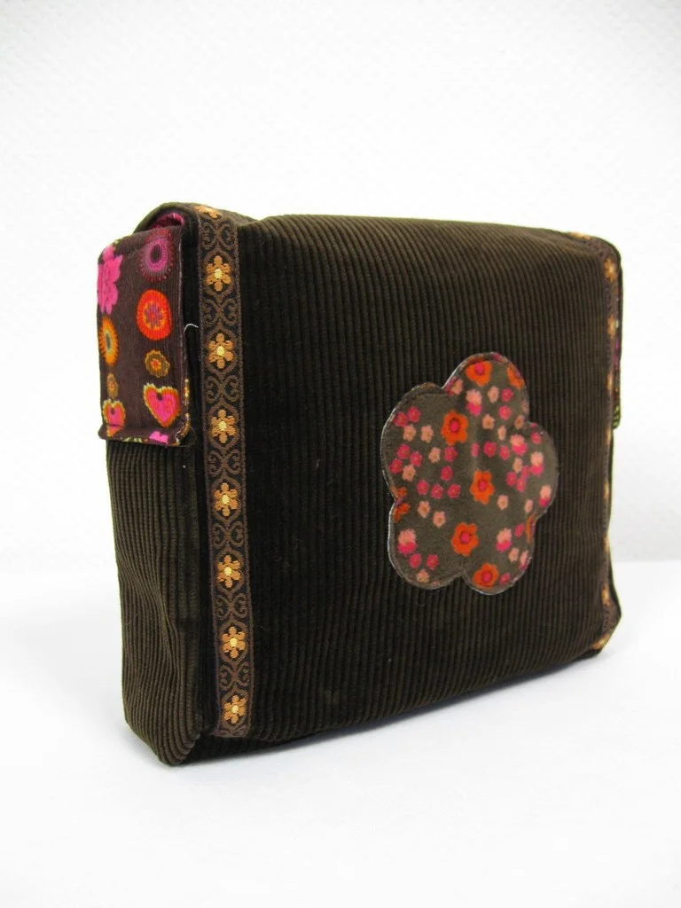 Die Tasche ist aus Baumwolle und Cord und hat hübsche Applikationen. Sie wird mit zwei Klettverschlüssen verschlossen.