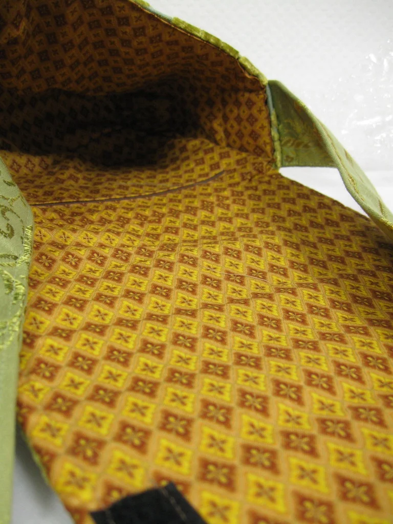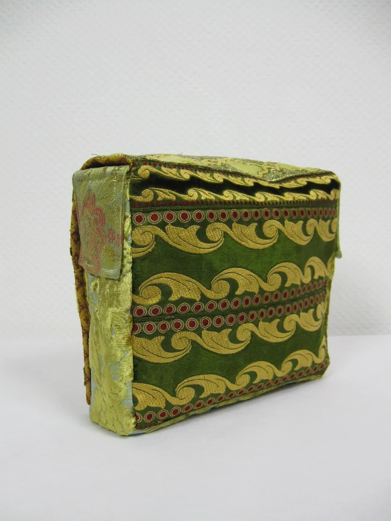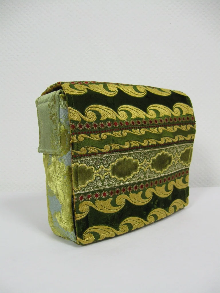 Die Tasche ist aus Baumwolle und Brokatstoff und hat hübsche Applikationen. Sie wird mit zwei Klettverschlüssen verschlossen.
