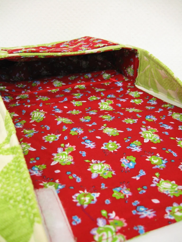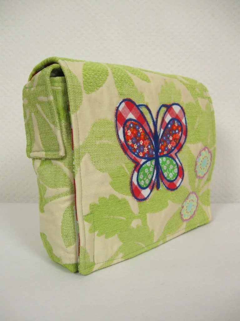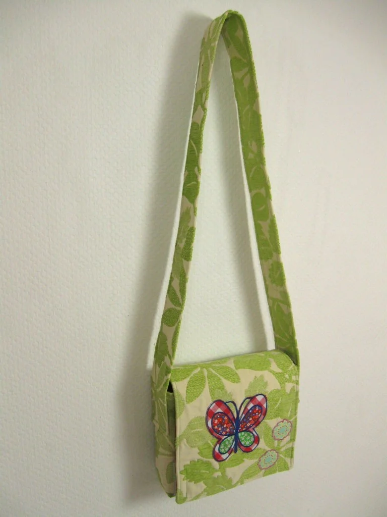 Die Tasche ist aus Baumwolle und hat hübsche Applikationen. Sie wird mit zwei Klettverschlüssen verschlossen.