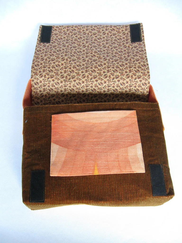 Die Tasche ist aus Baumwolle und Cord und wird mit zwei Klettverschlüssen verschlossen.