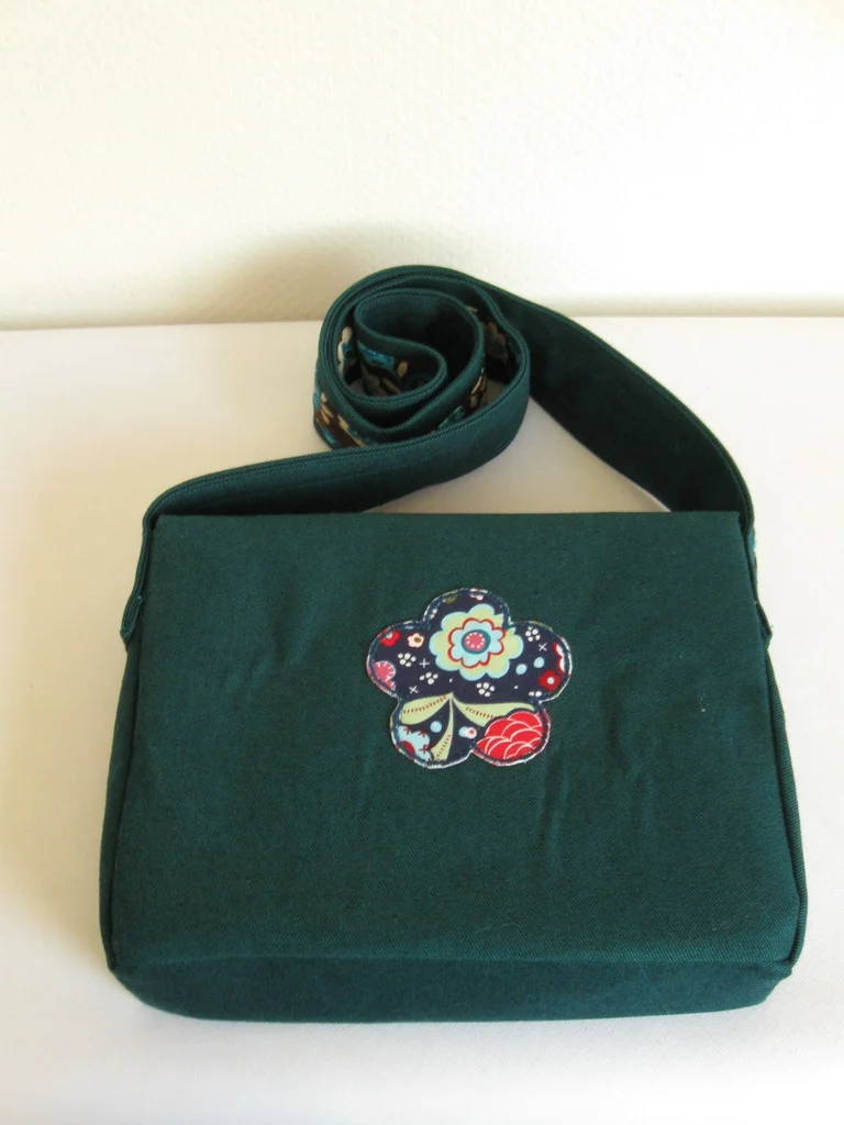 Die Tasche ist aus Baumwolle und Frottee und wird mit zwei Klettverschlüssen verschlossen. Sie hat zwei hübsche Applikationen.