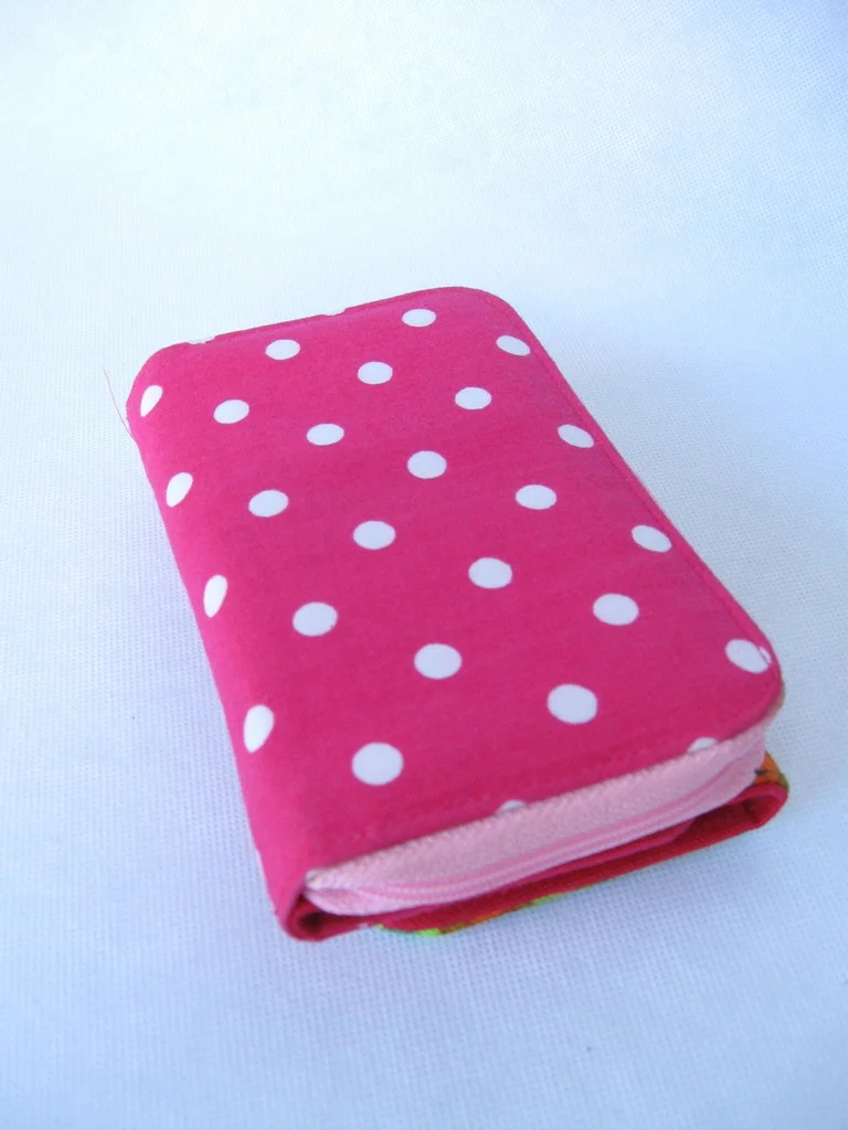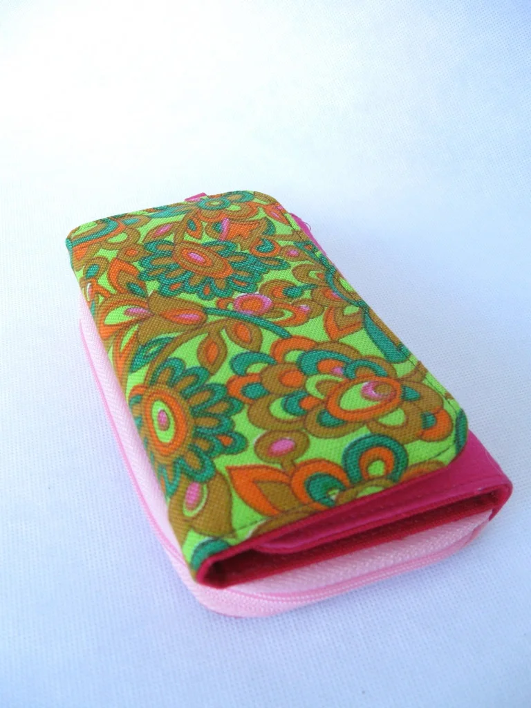 Designer-Portemonnaie aus Stoff im 70er Jahre-Design, mit Druckknopf zum Schließen.