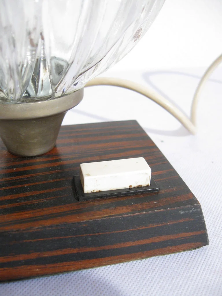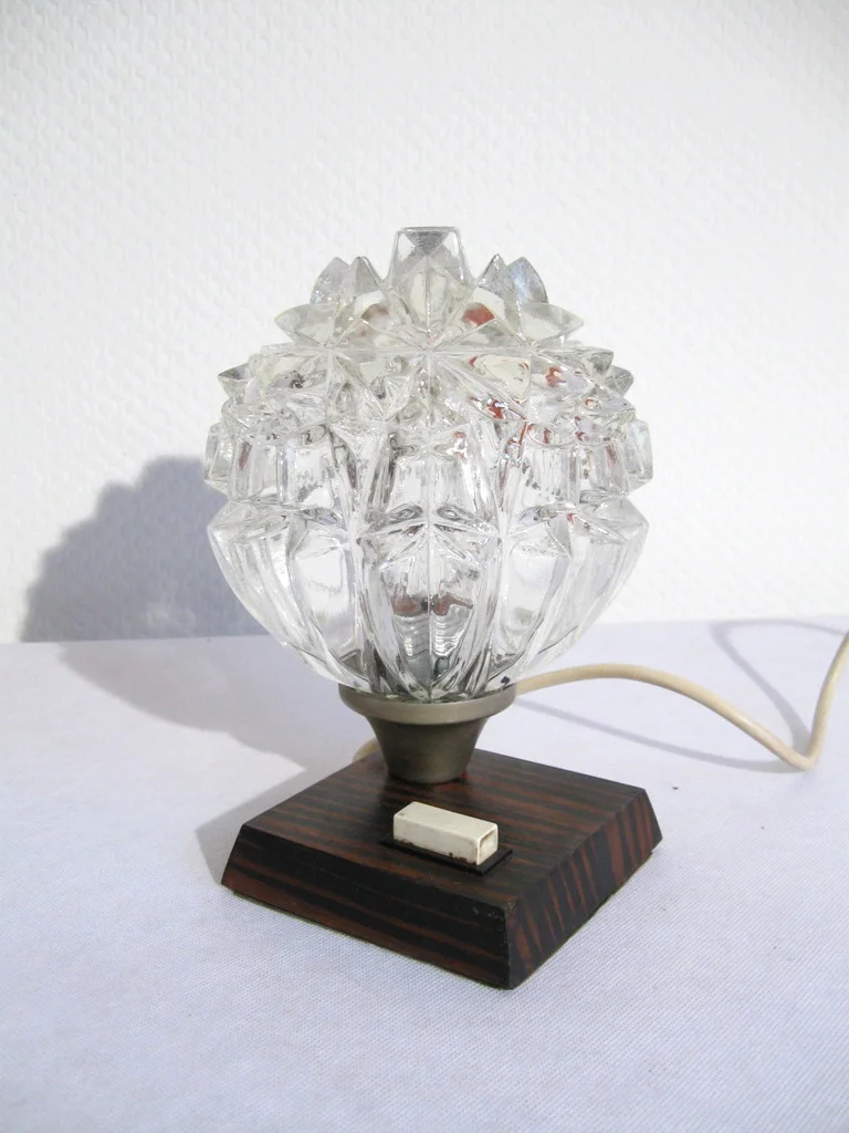 Die Leuchte besteht aus einem Glasschirm in Kristallform und einem Holzfuß.