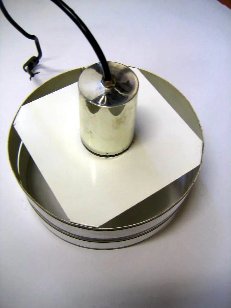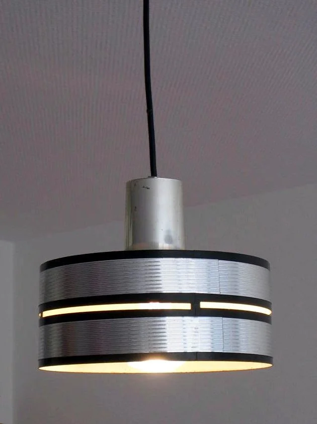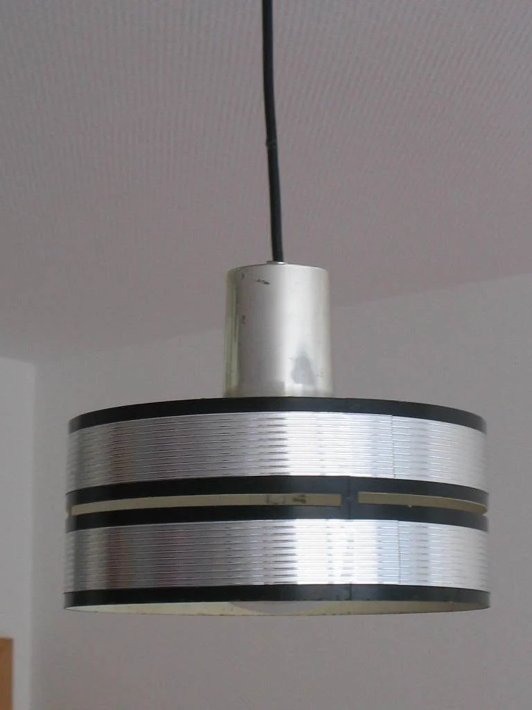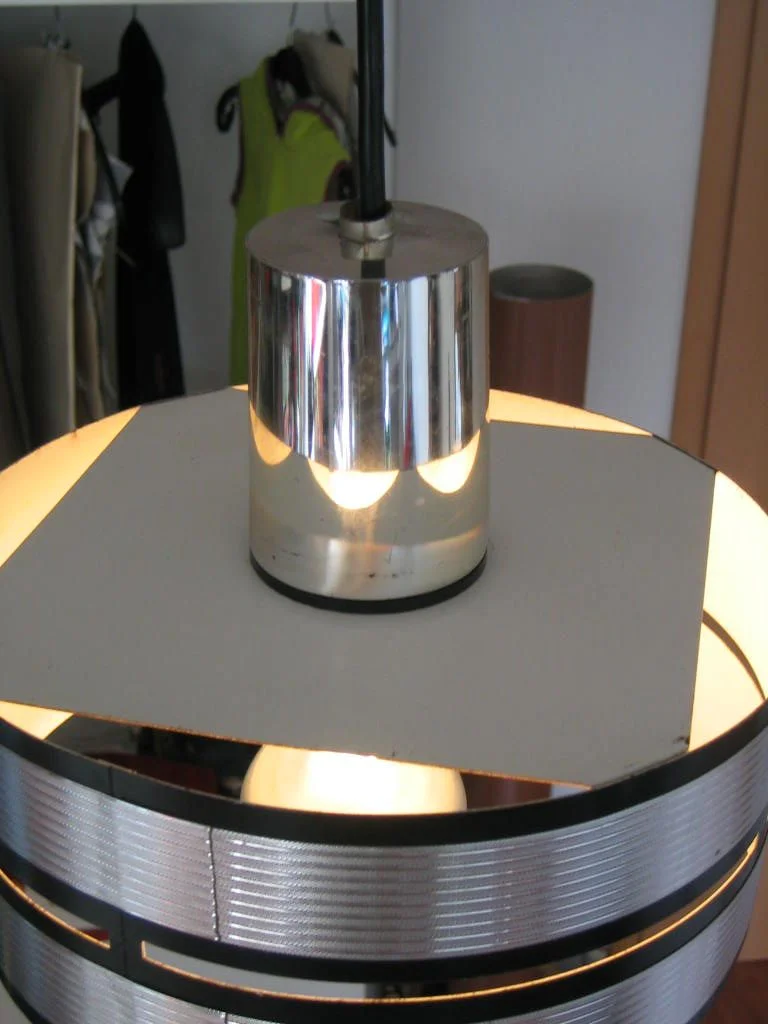 Schicke 70er Pendelleuchte aus Metall, mit Chrom-Applikationen.