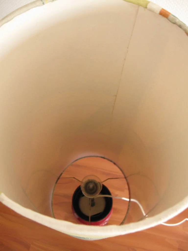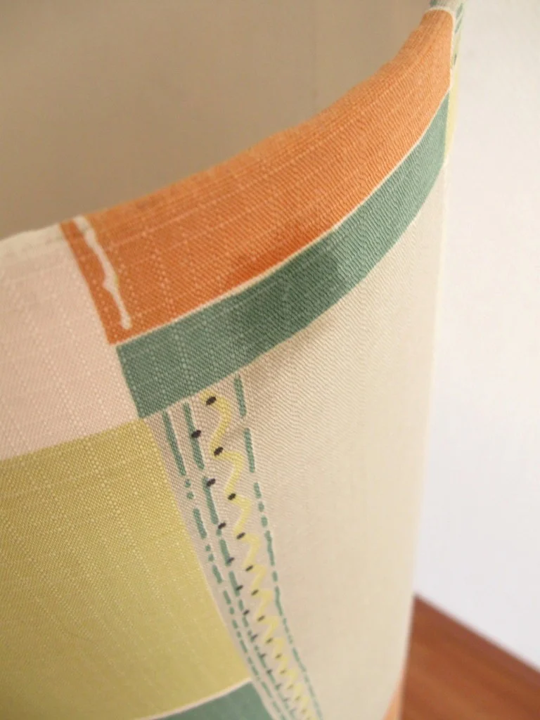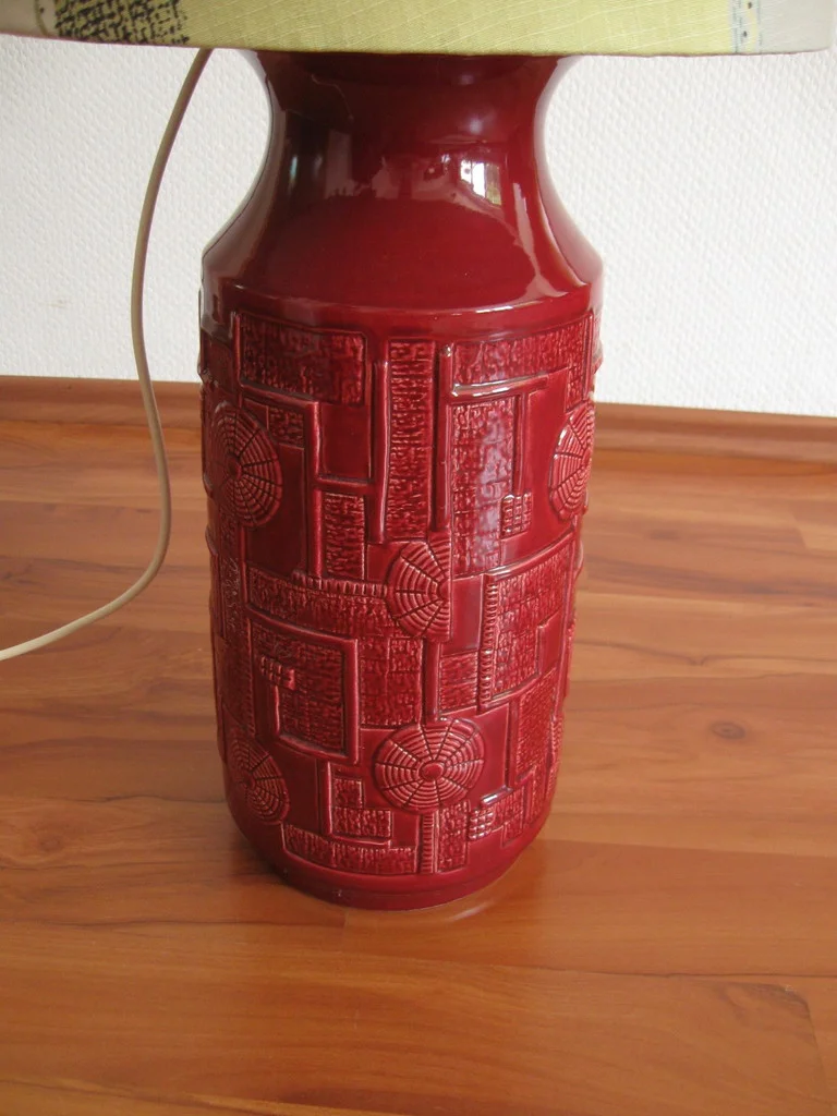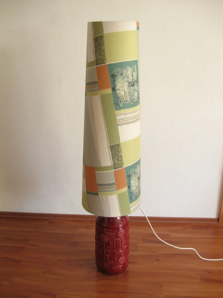 Die Leuchte besteht aus einem Standfuß aus glasierter Keramik und einem Lampenschirm. Der Schirm ist mit einem Baumwollstoff aus den 1950er Jahren bezogen. Das Kabel ist mit einem Fußschalter versehen.