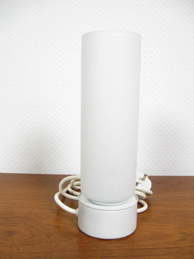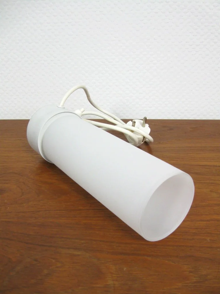 Die Leuchte besteht aus einem Milchglasschirm und einem Metallfuß.