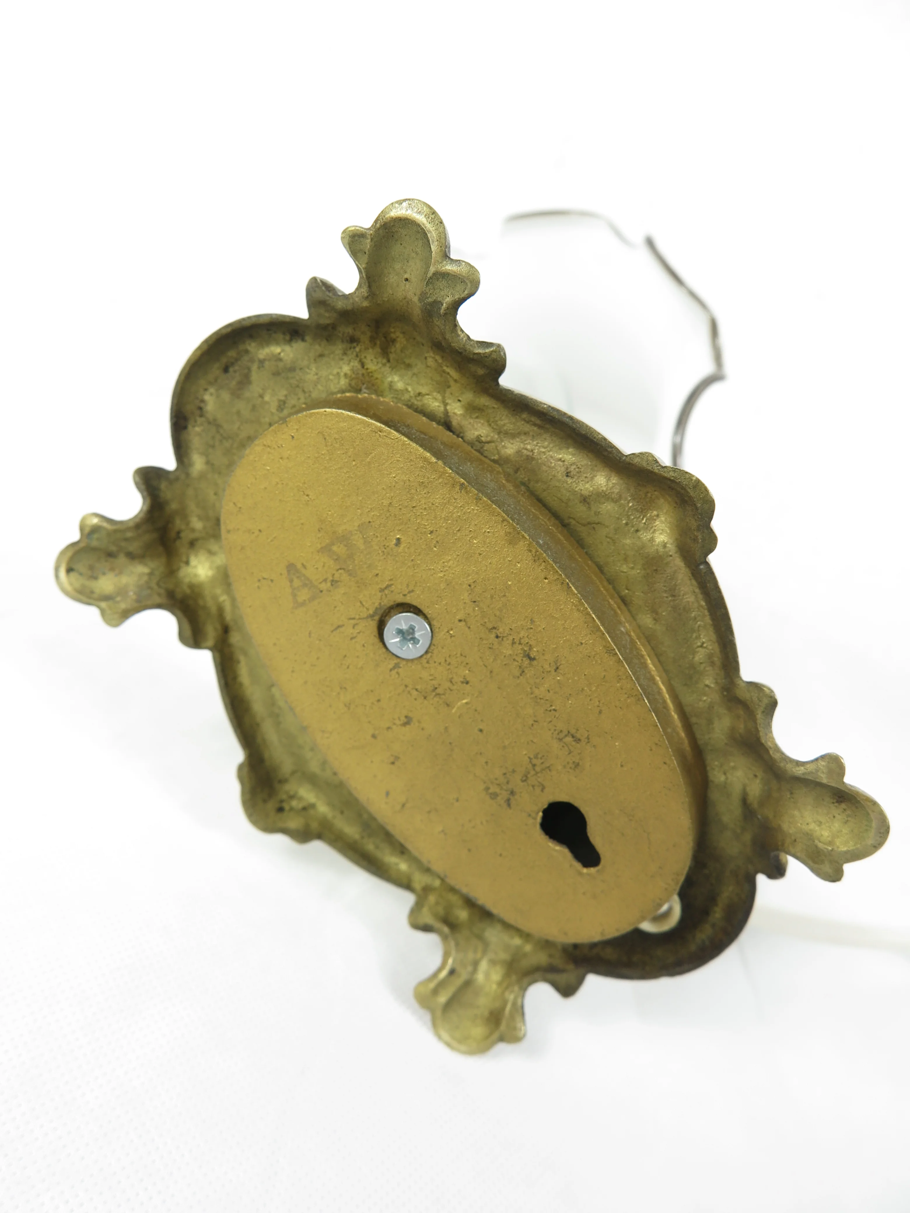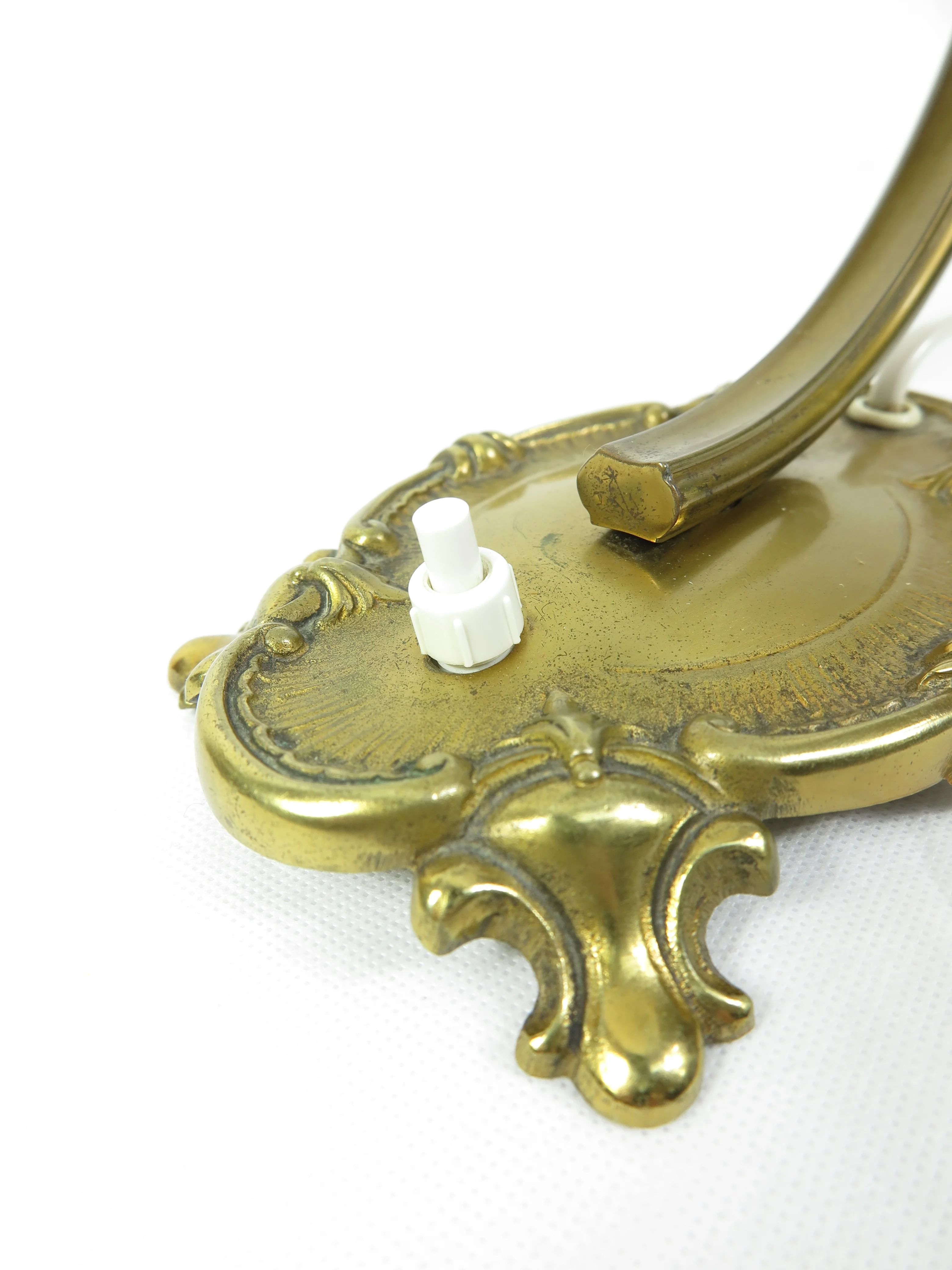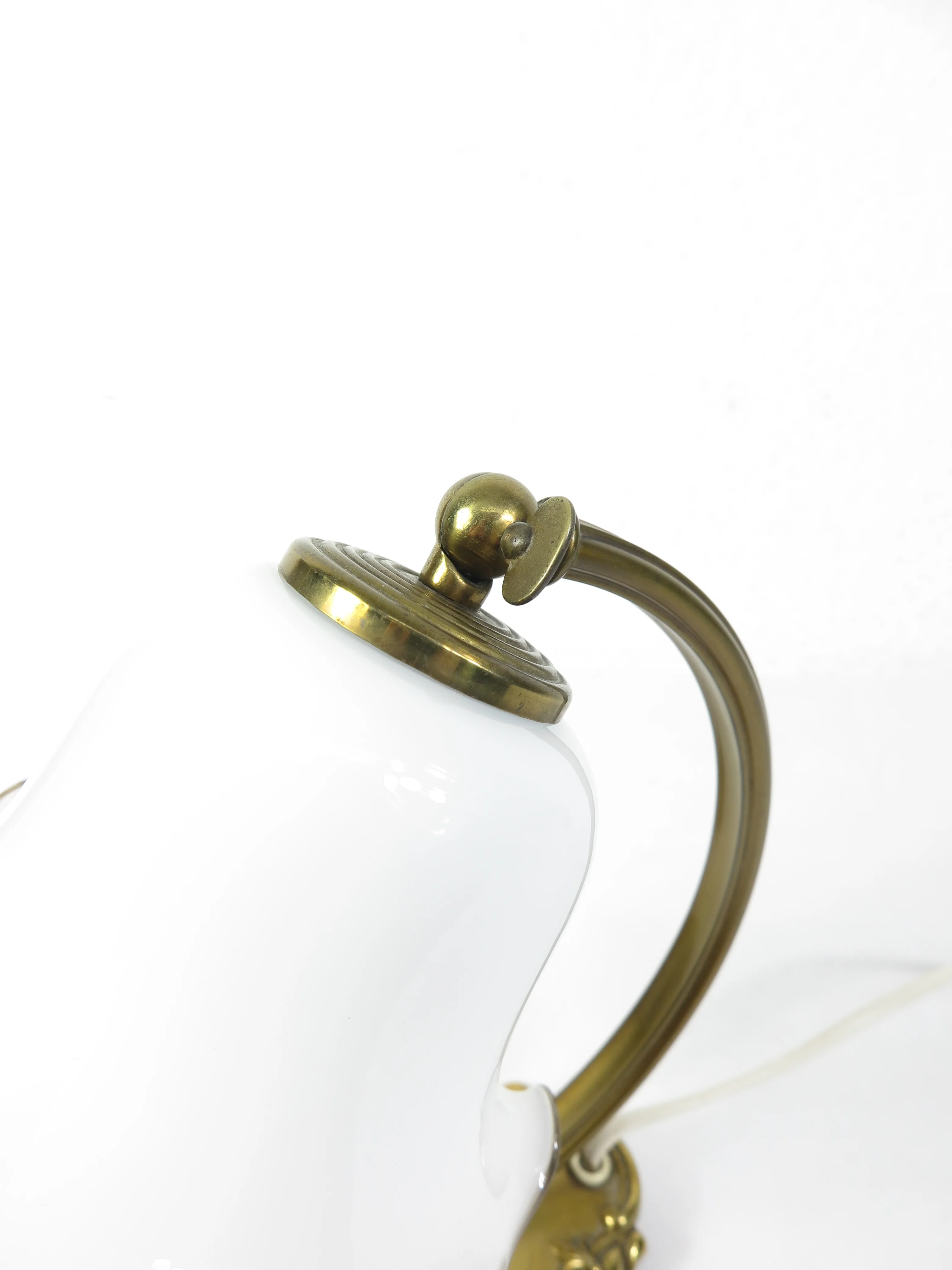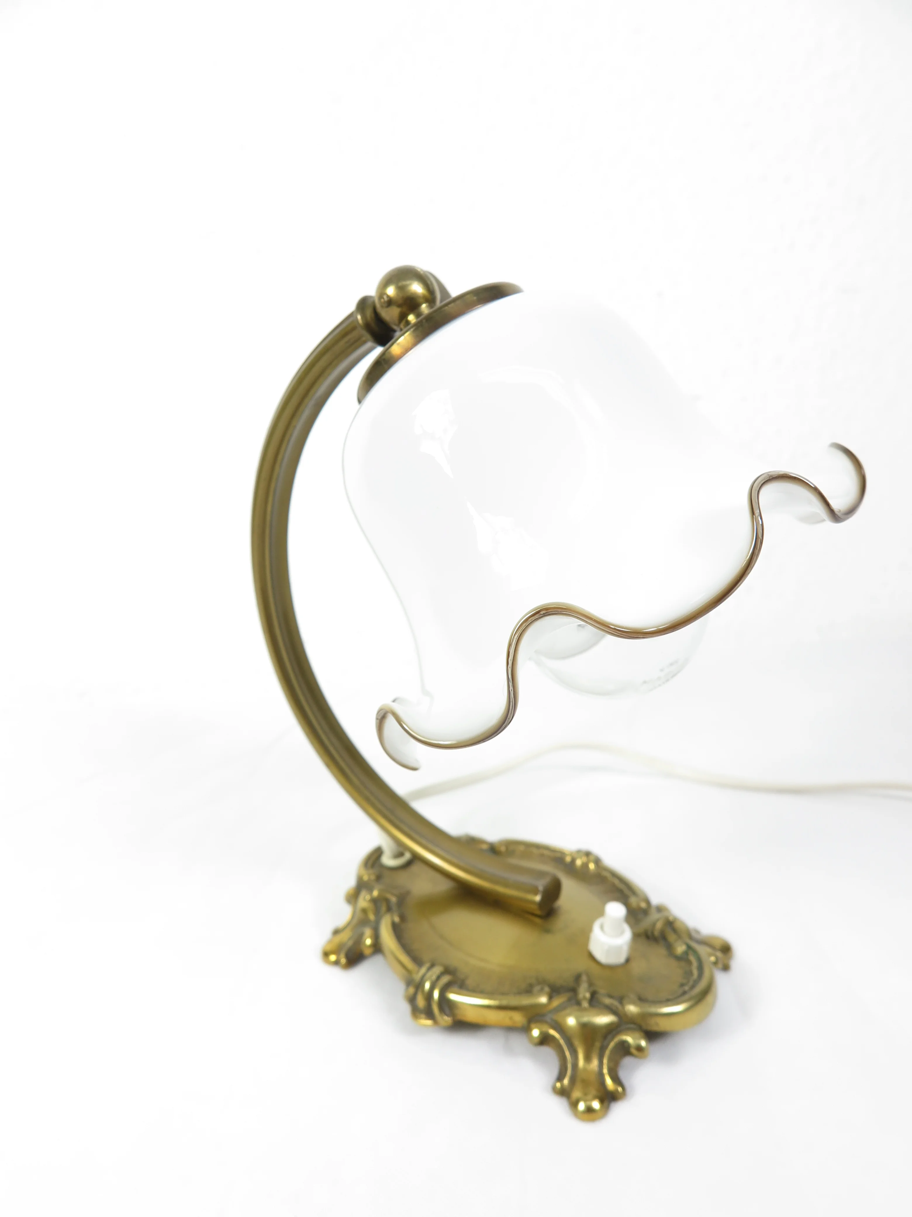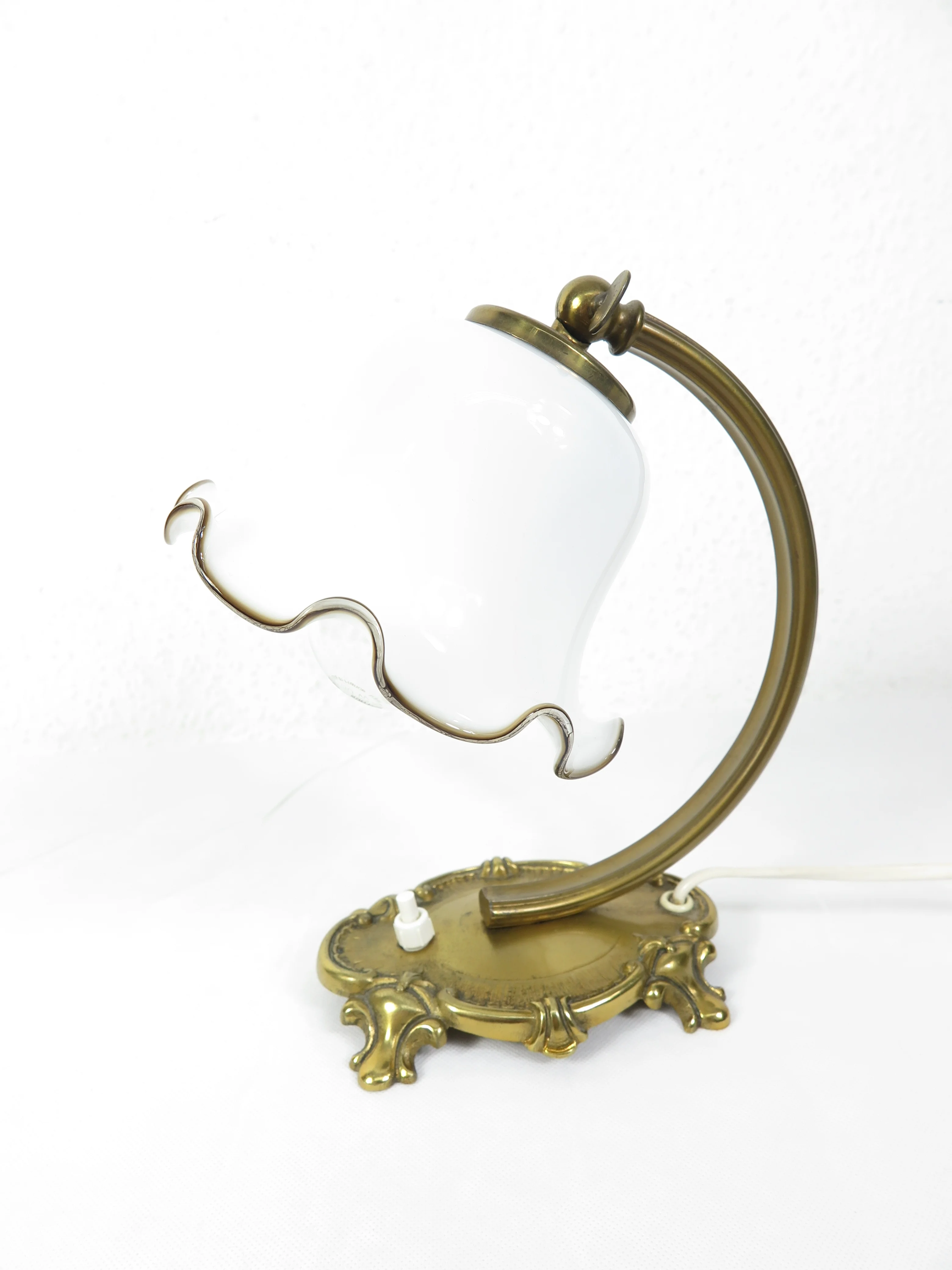 Die Lampe besticht durch einen weißen Glasschirm, der einen wellenförmigen Rand hat, ergänzt durch einen geschwungenen Messingfuß.