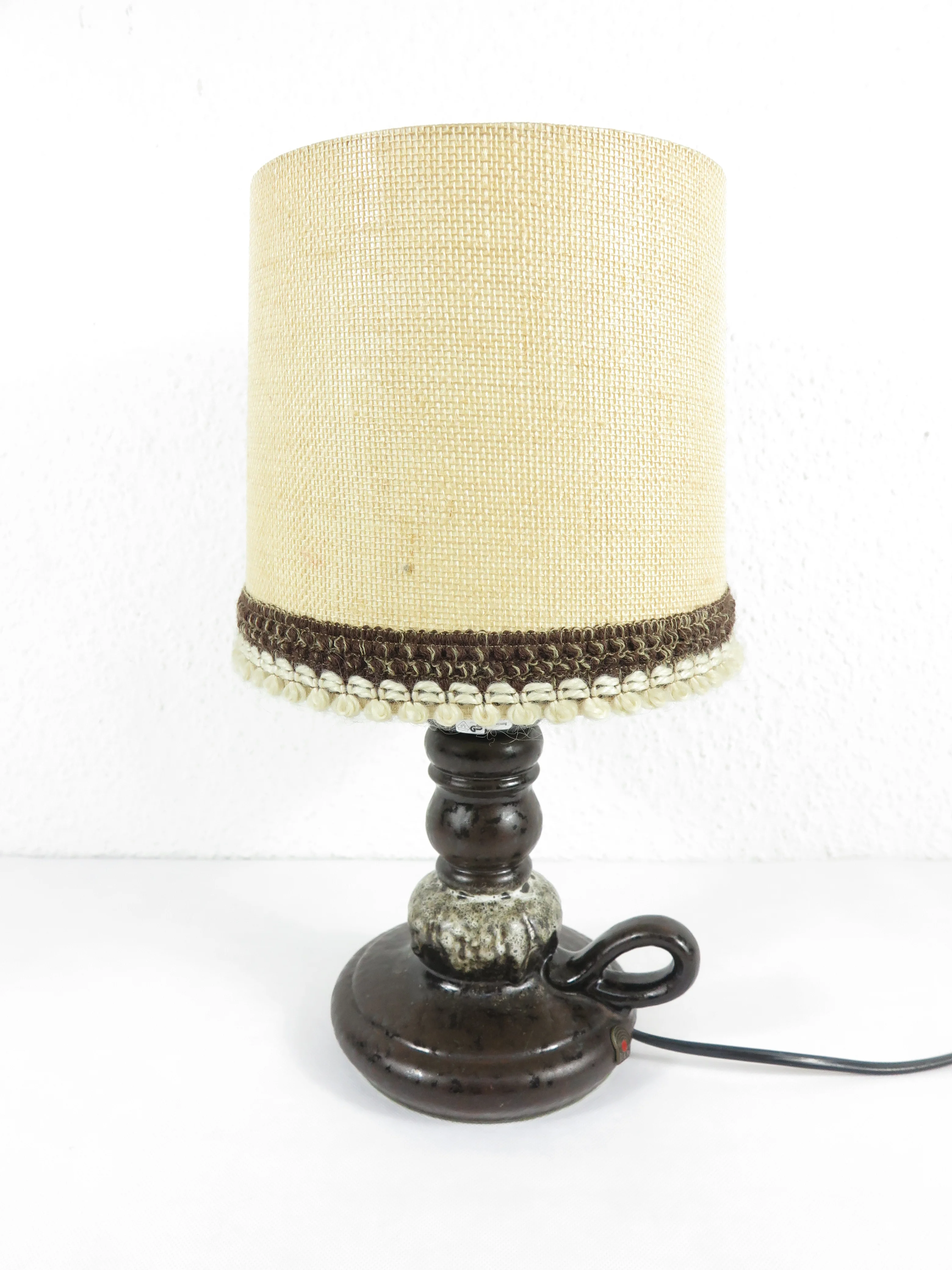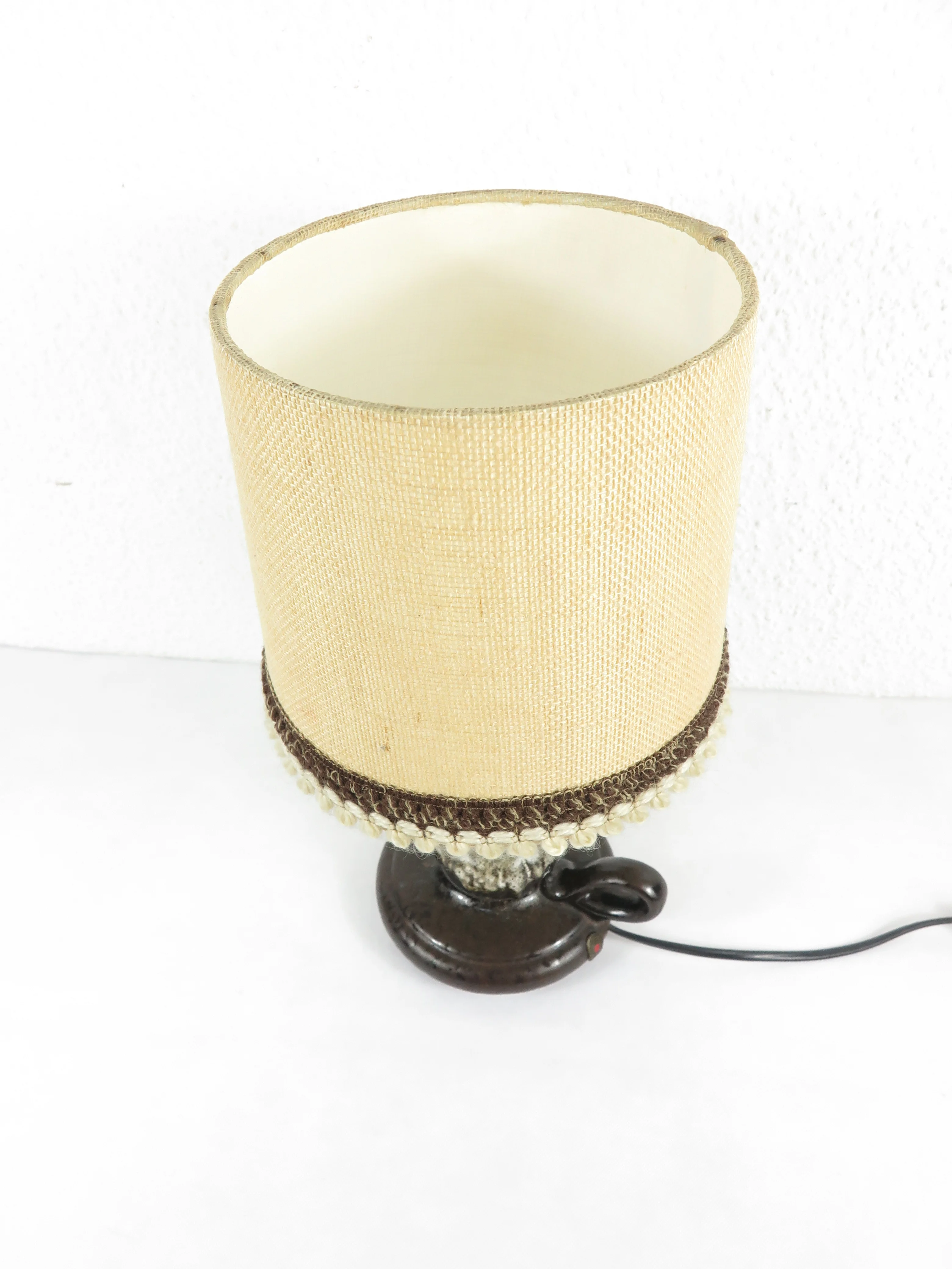 Der Lampenschirm ist in Leinenoptik und der Fuß ist handglasiert.