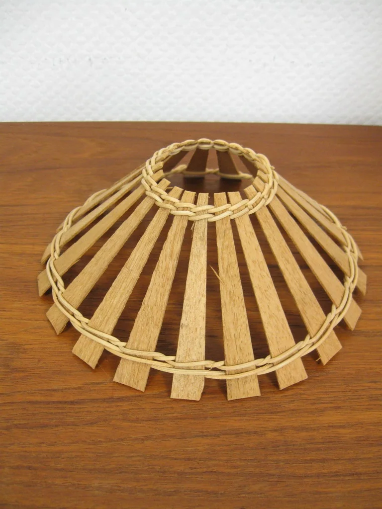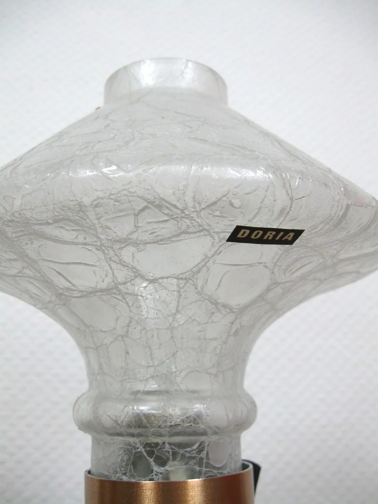Die Leuchte besteht aus einer Metallhalterung, einem Glasschirm und einem Aufsatz aus Holz und Flechtwerk. Alles hochwertig verarbeitet in den Doria Werken.