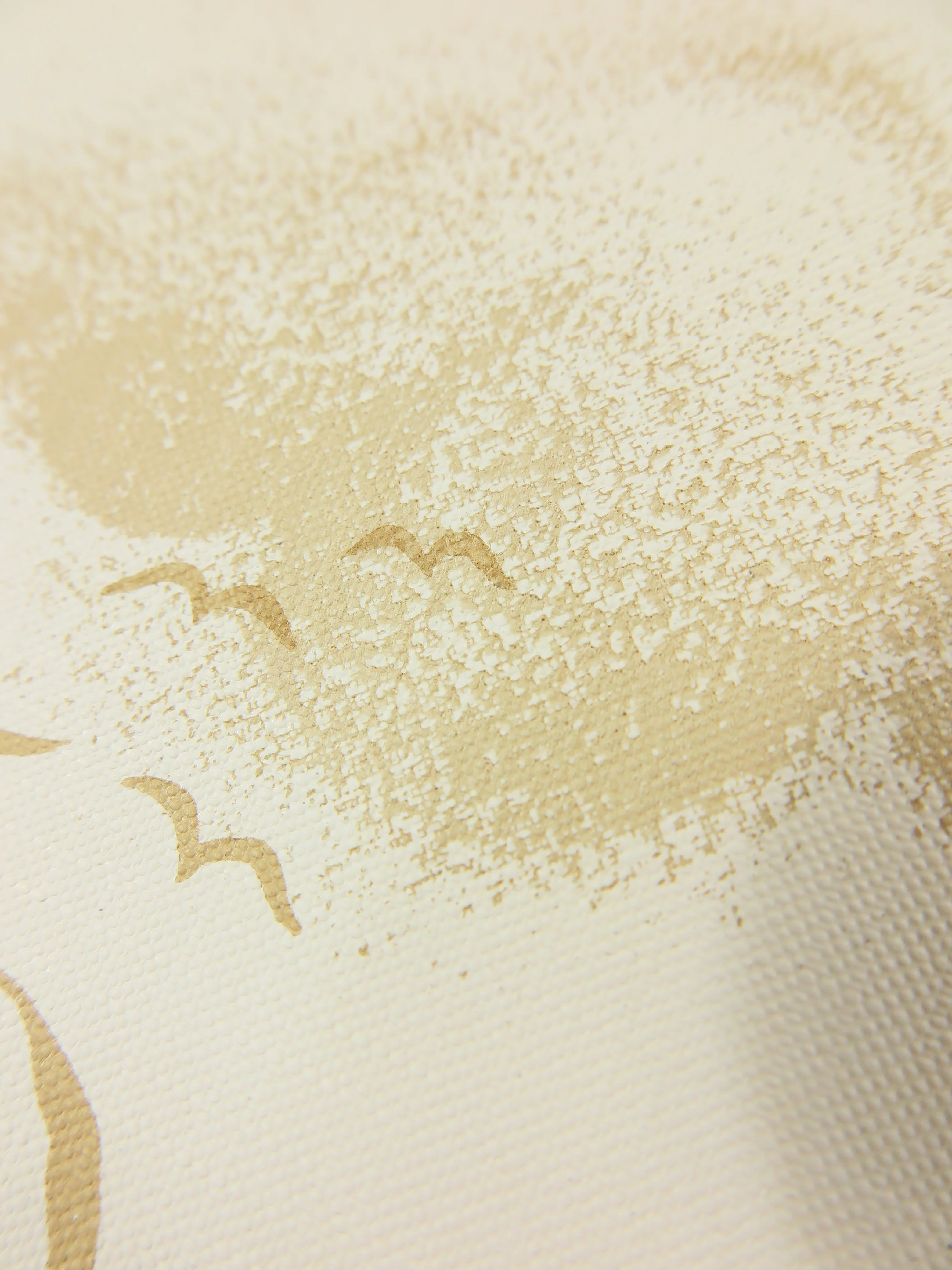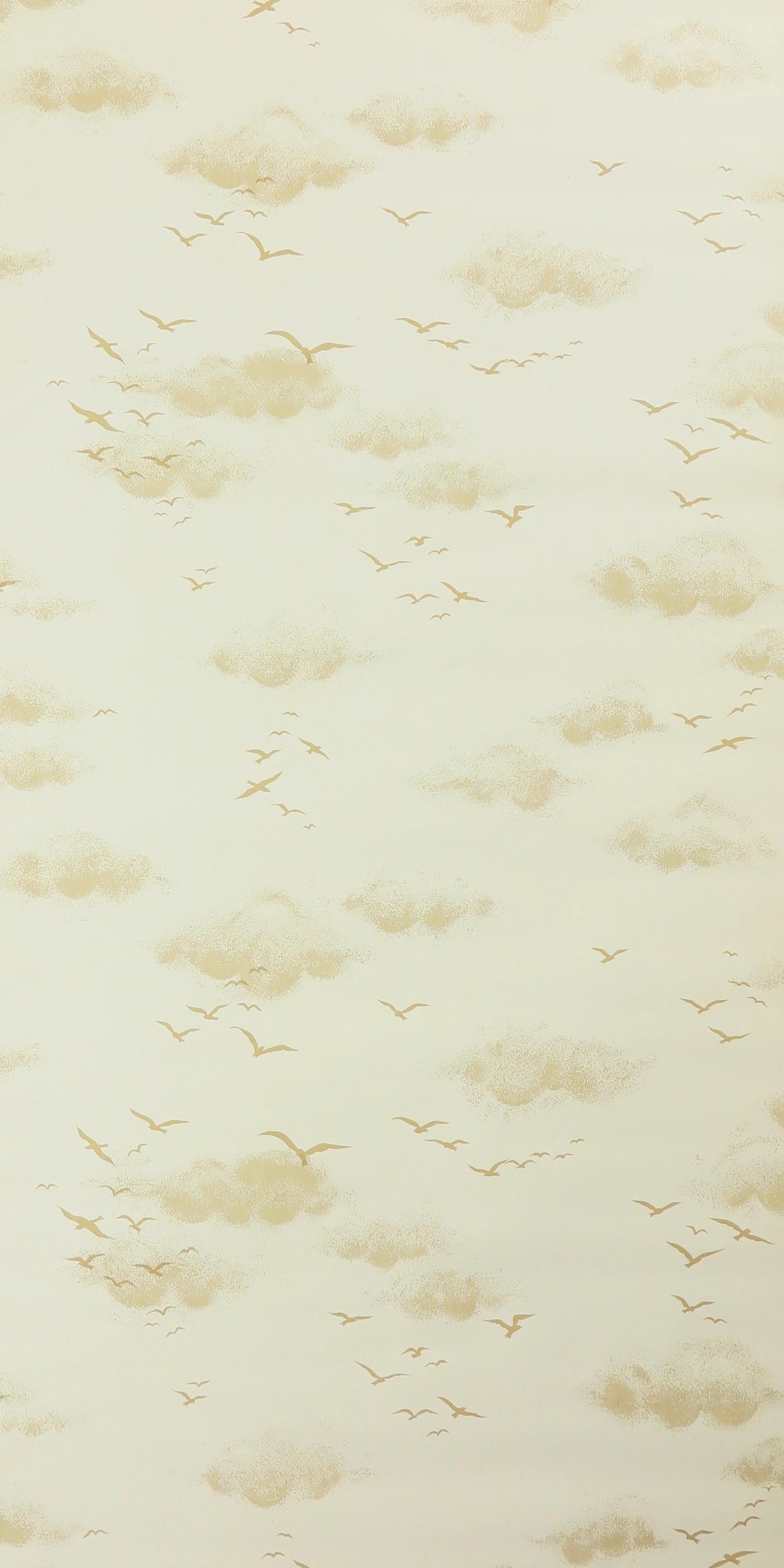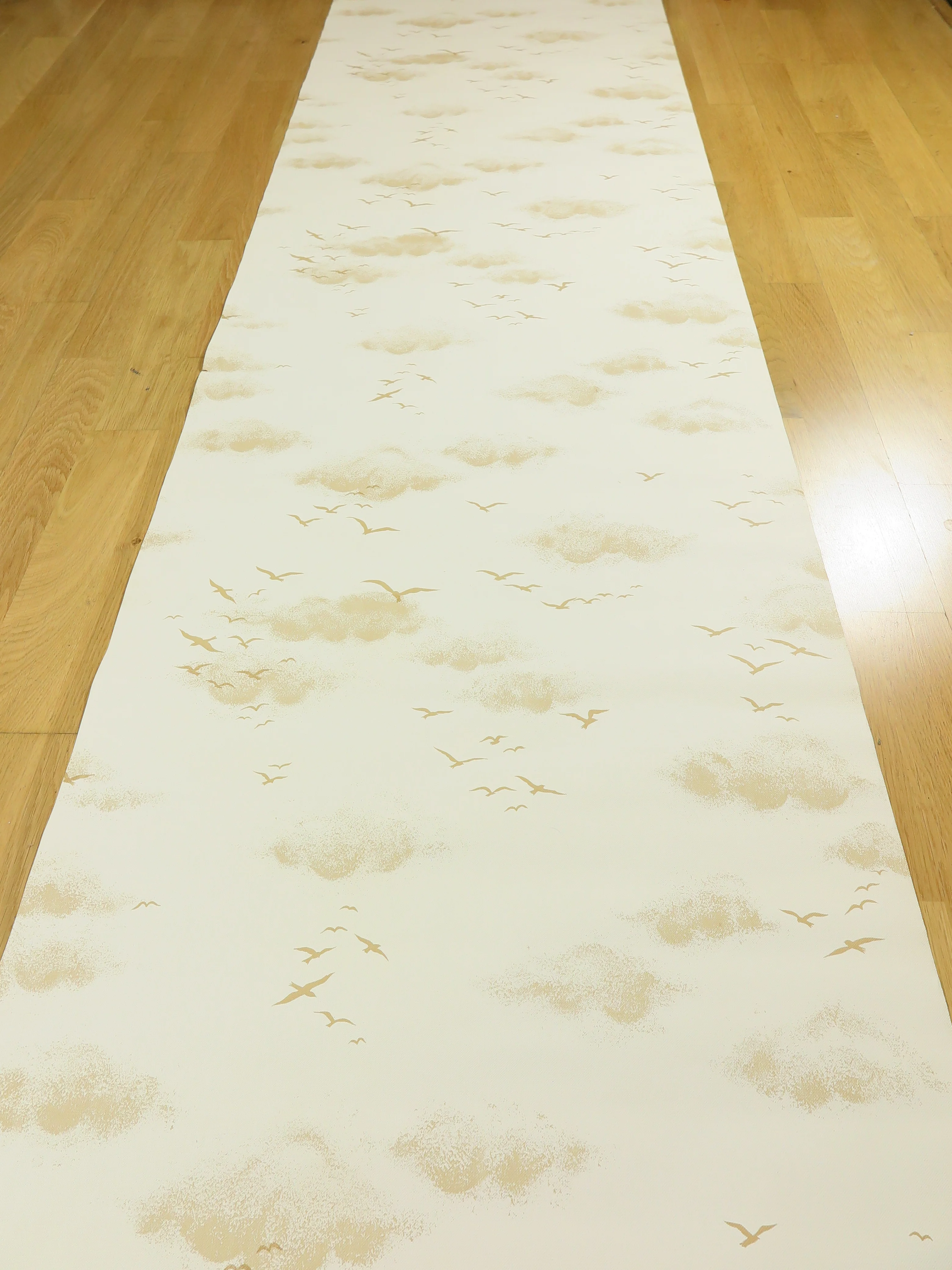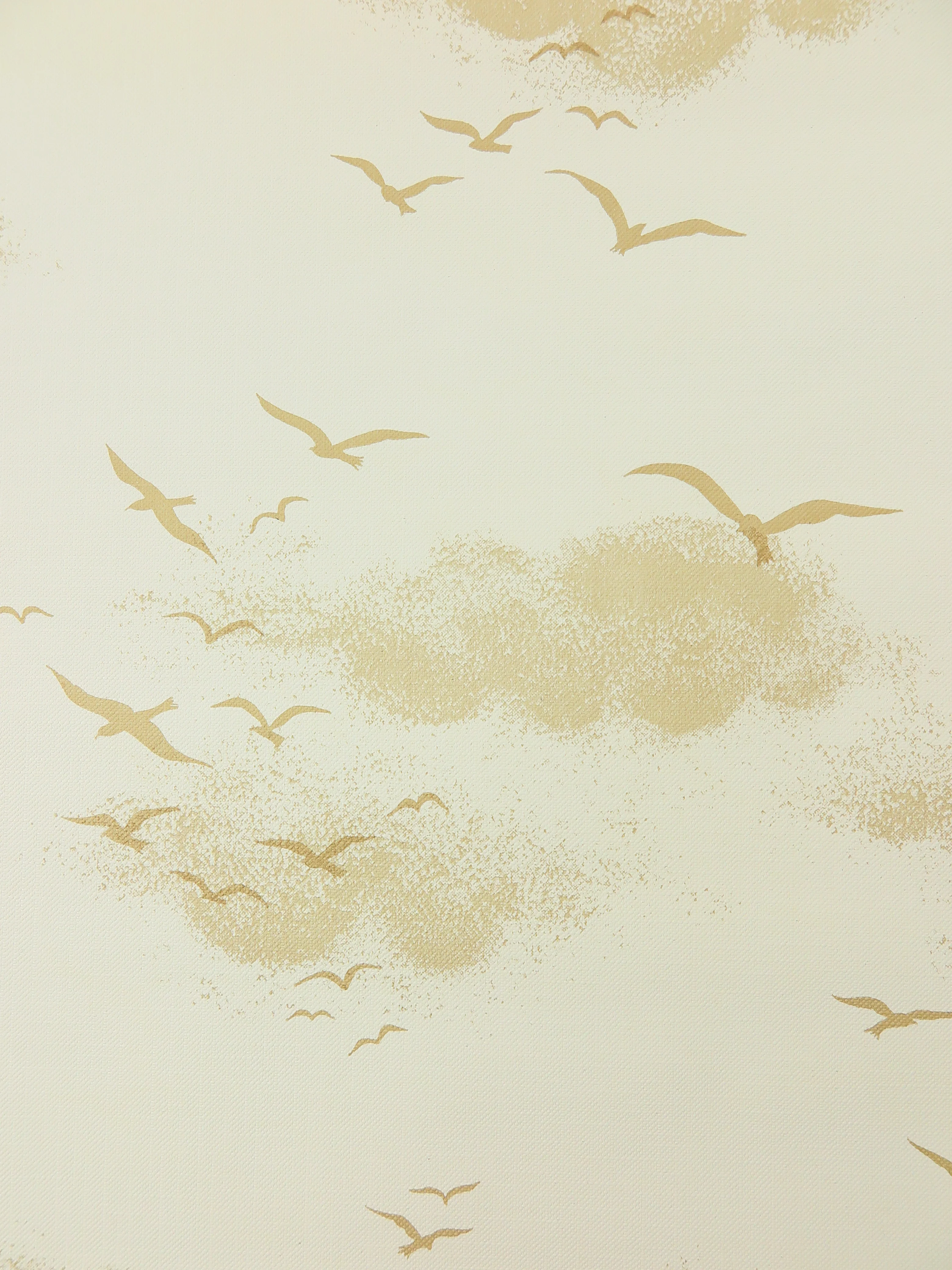 Typische original 70er Jahre Tapete mit Vögeln und Wolken in beige auf cremefarbenen Hintergrund.