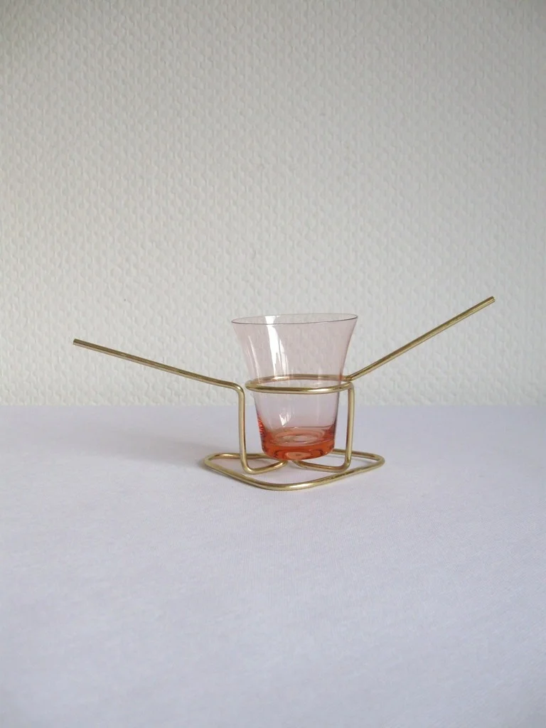 The holder consists of a brass frame and a coloured glass insert.