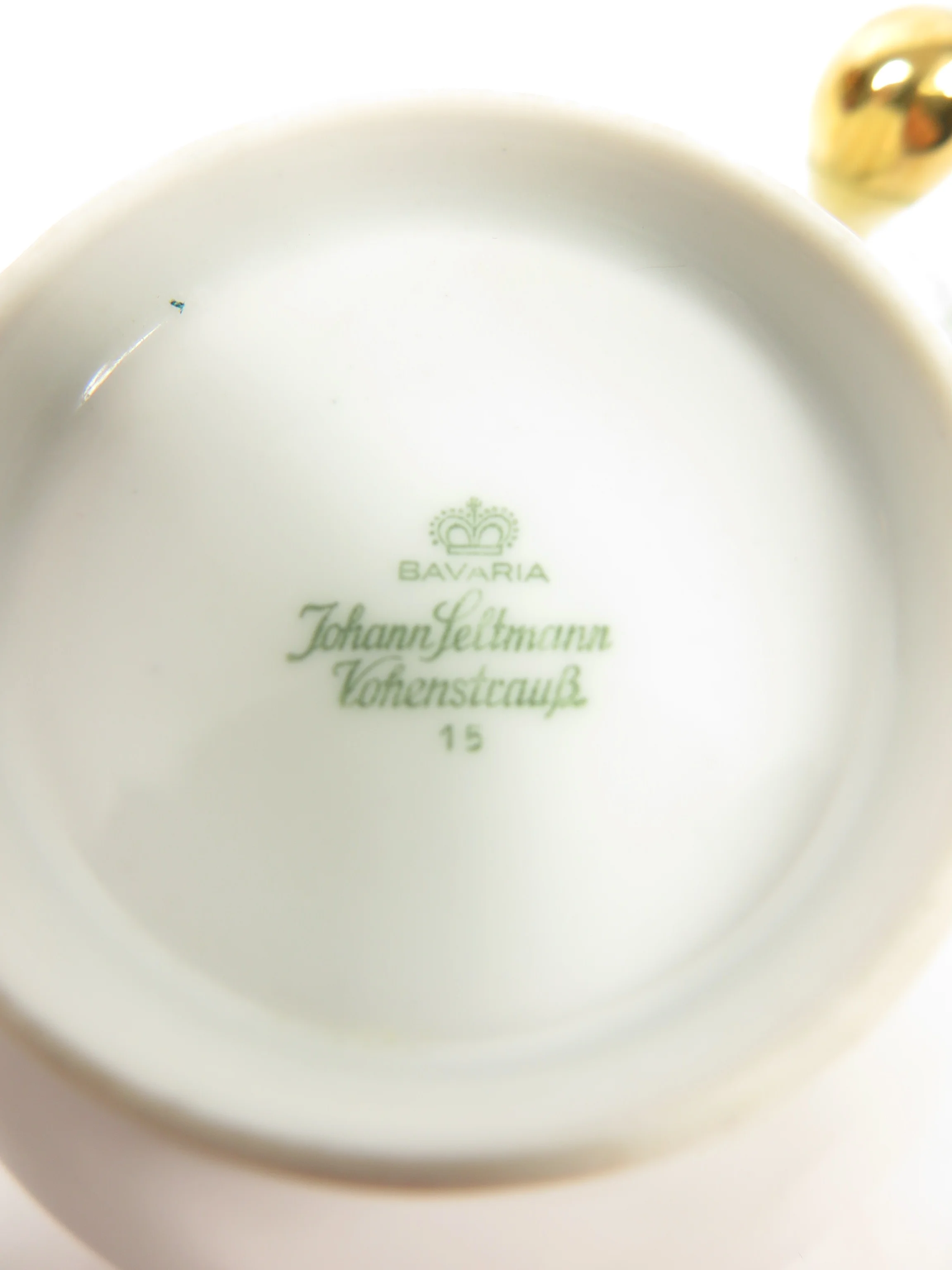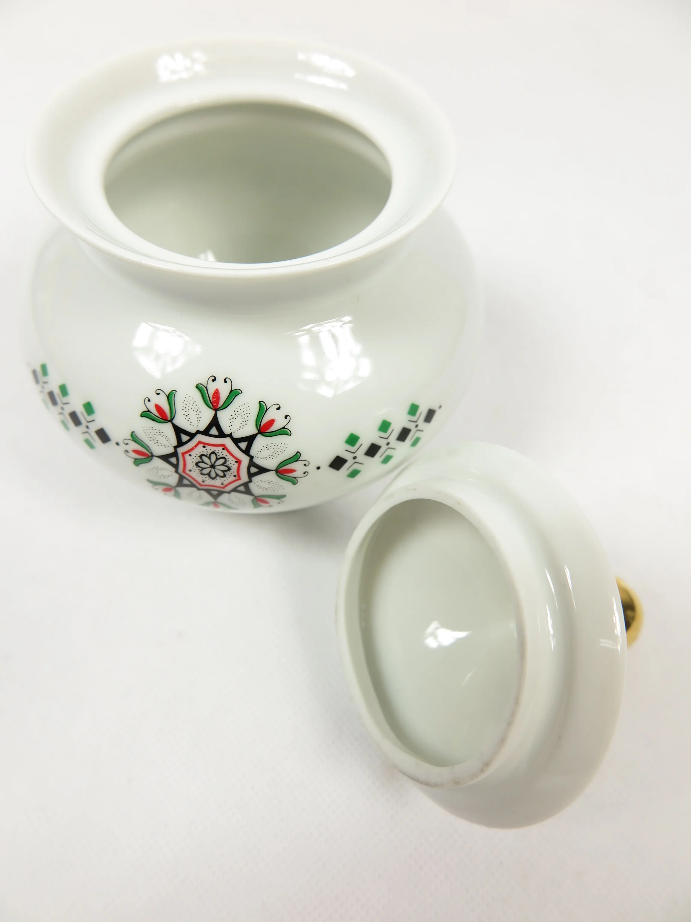 The tin is made of porcelain of the company Johann Seltmann, model Vohenstauß. It is decorated with a real gold knob and has a beautiful pattern of green, black and red.