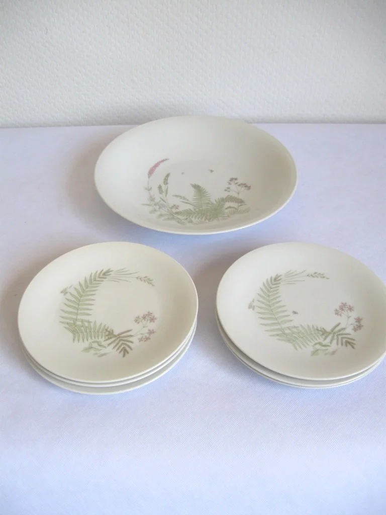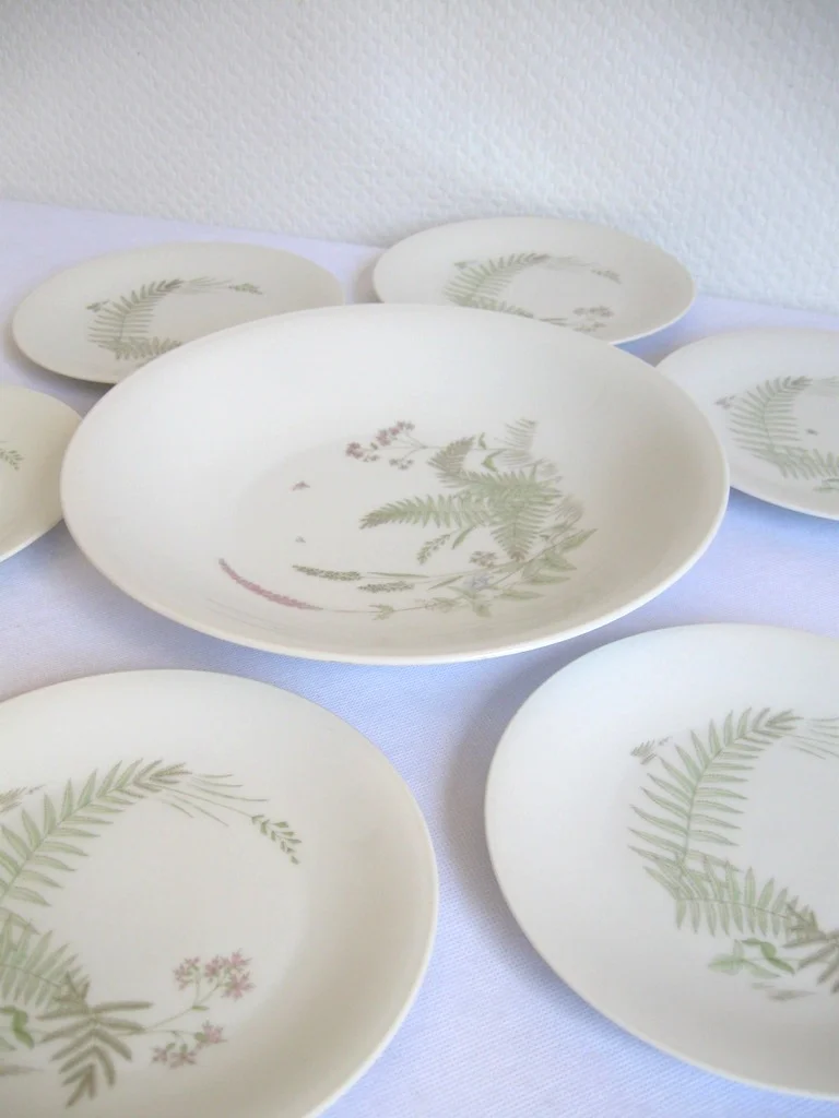 The set consists of six small plates and one large plate. The plates are made of porcelain and show a floral motif.