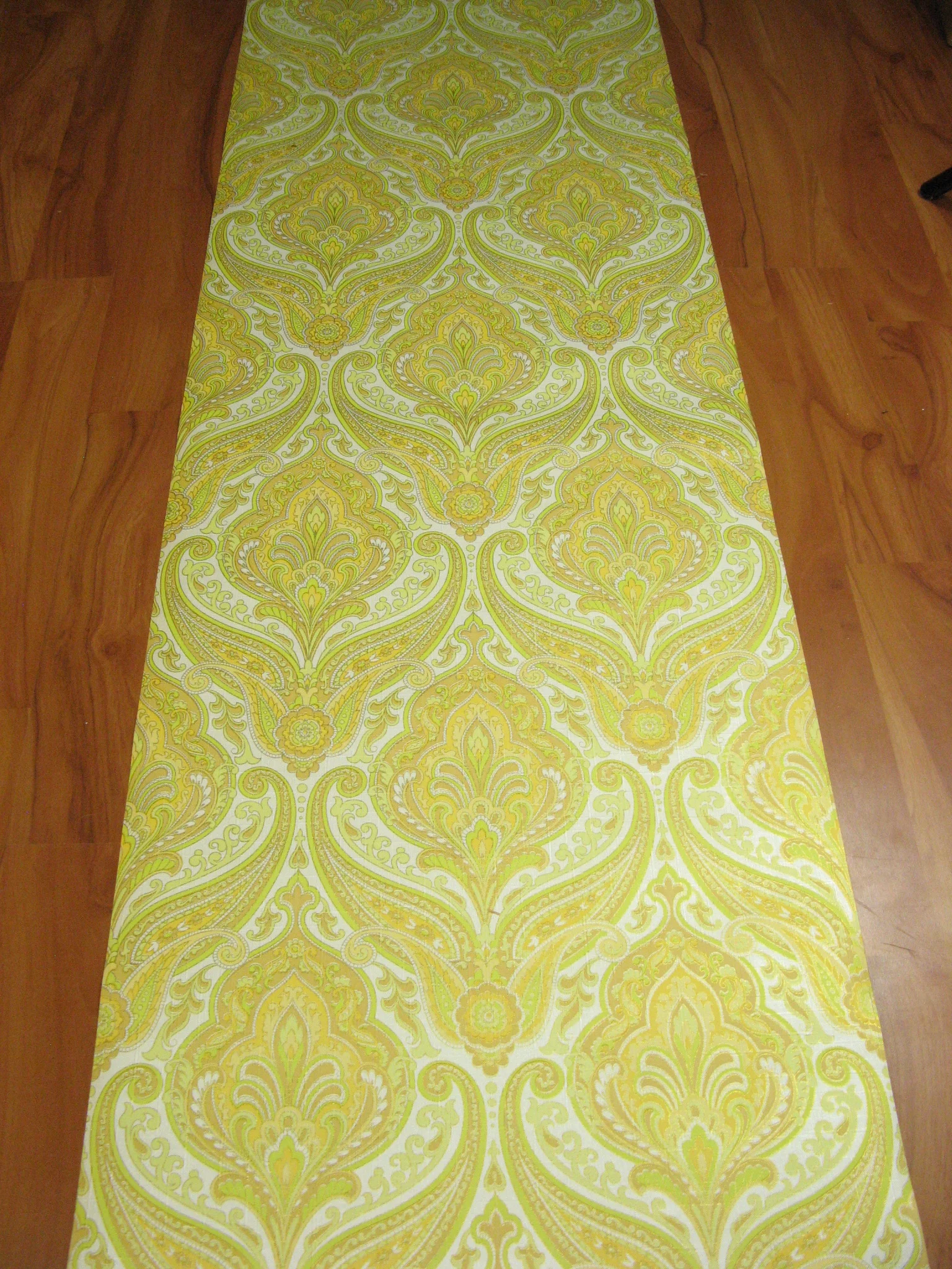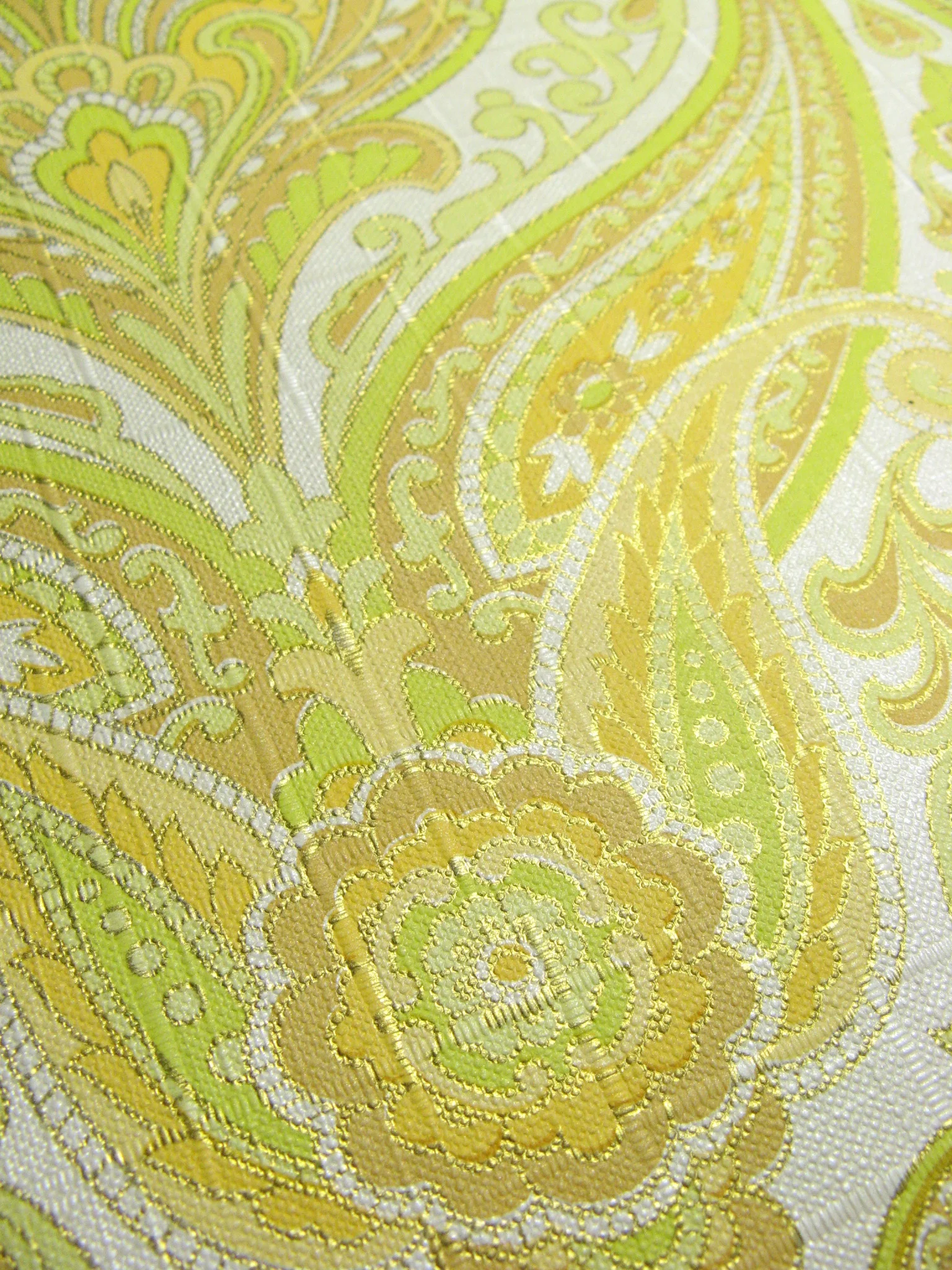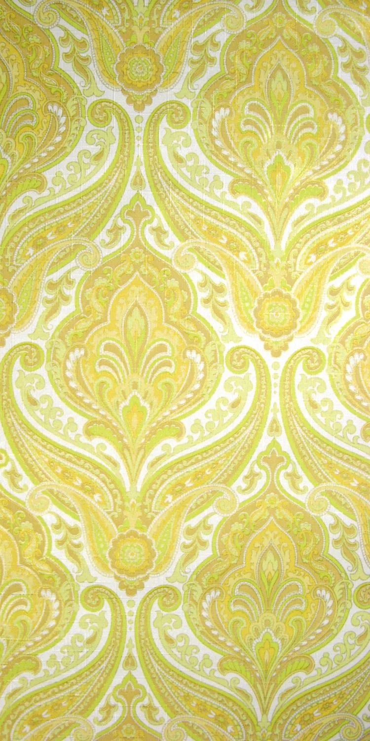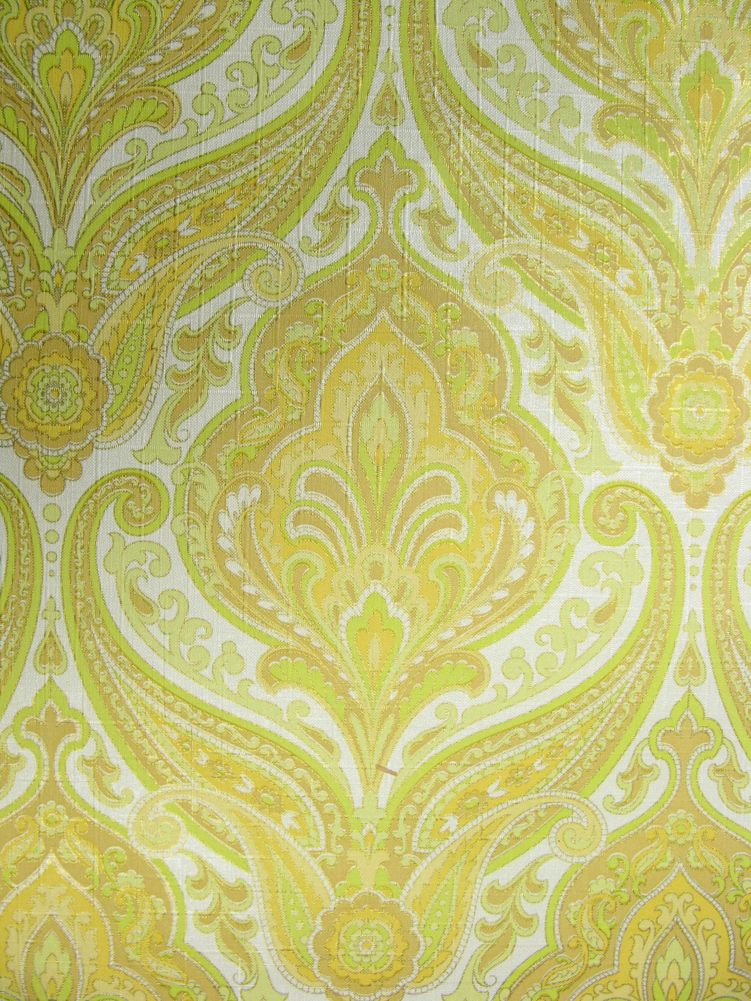 Unusual paper wallpaper from the 1970s in spring green, orange, light brown and mother-of-pearl white